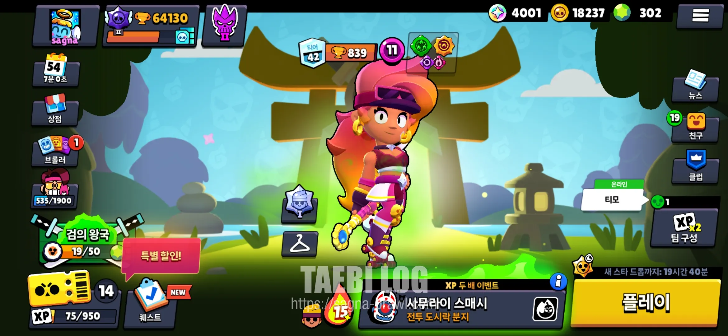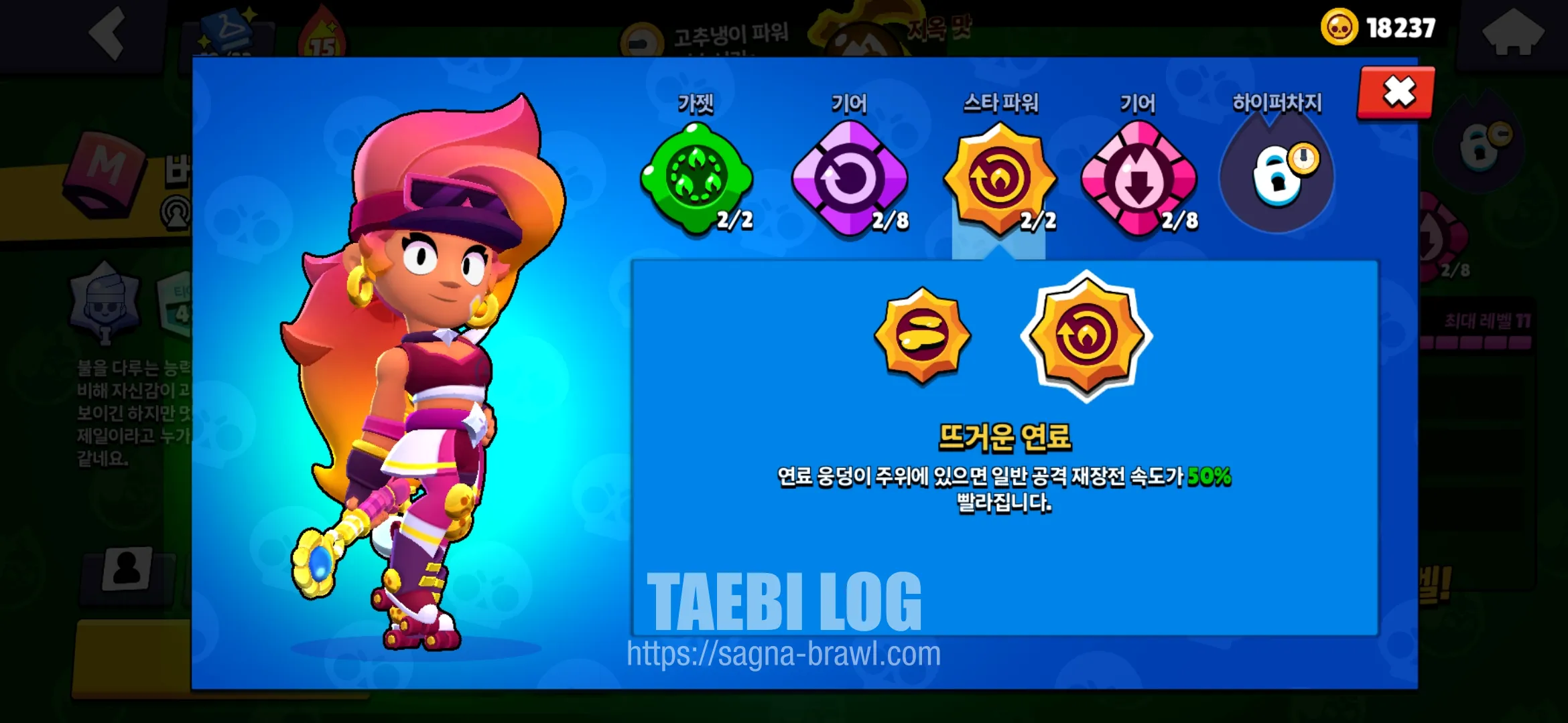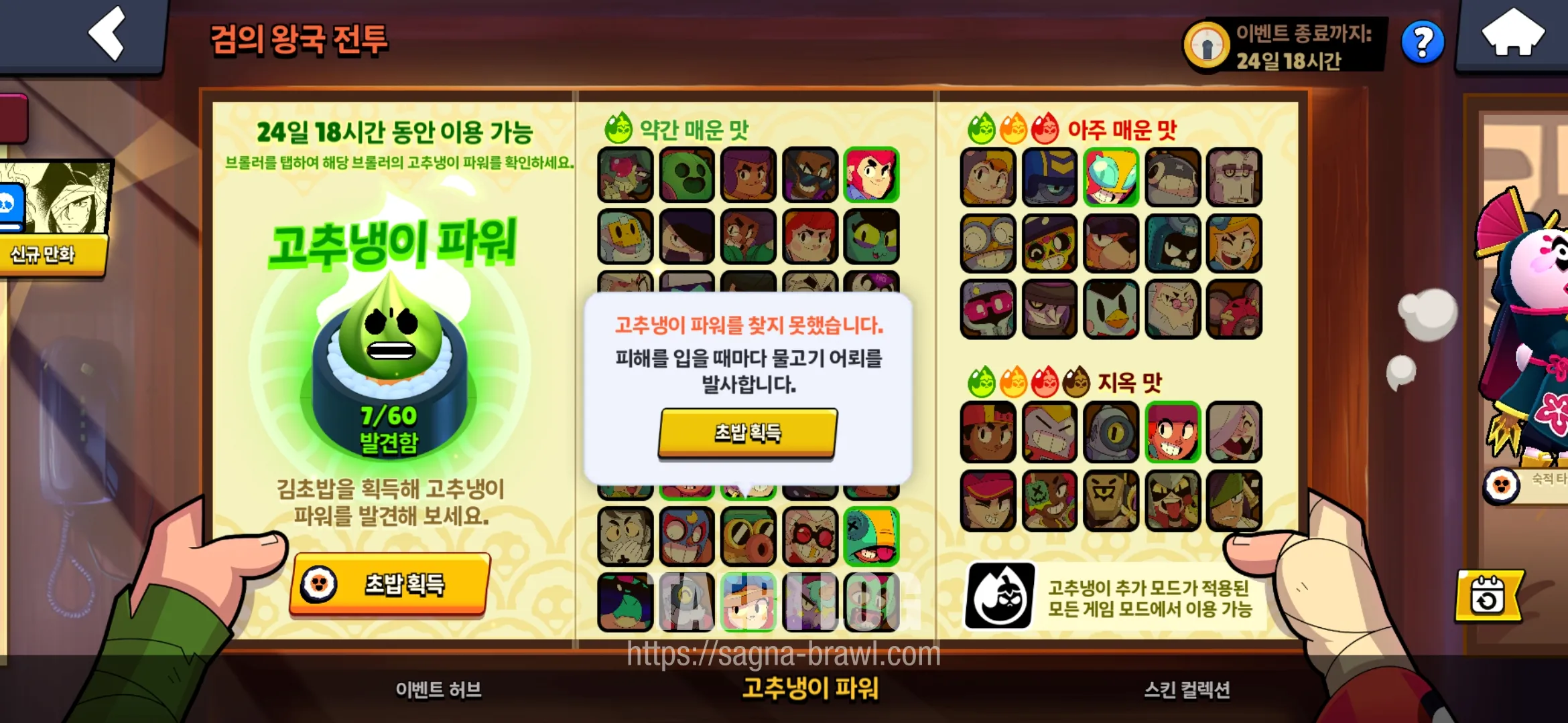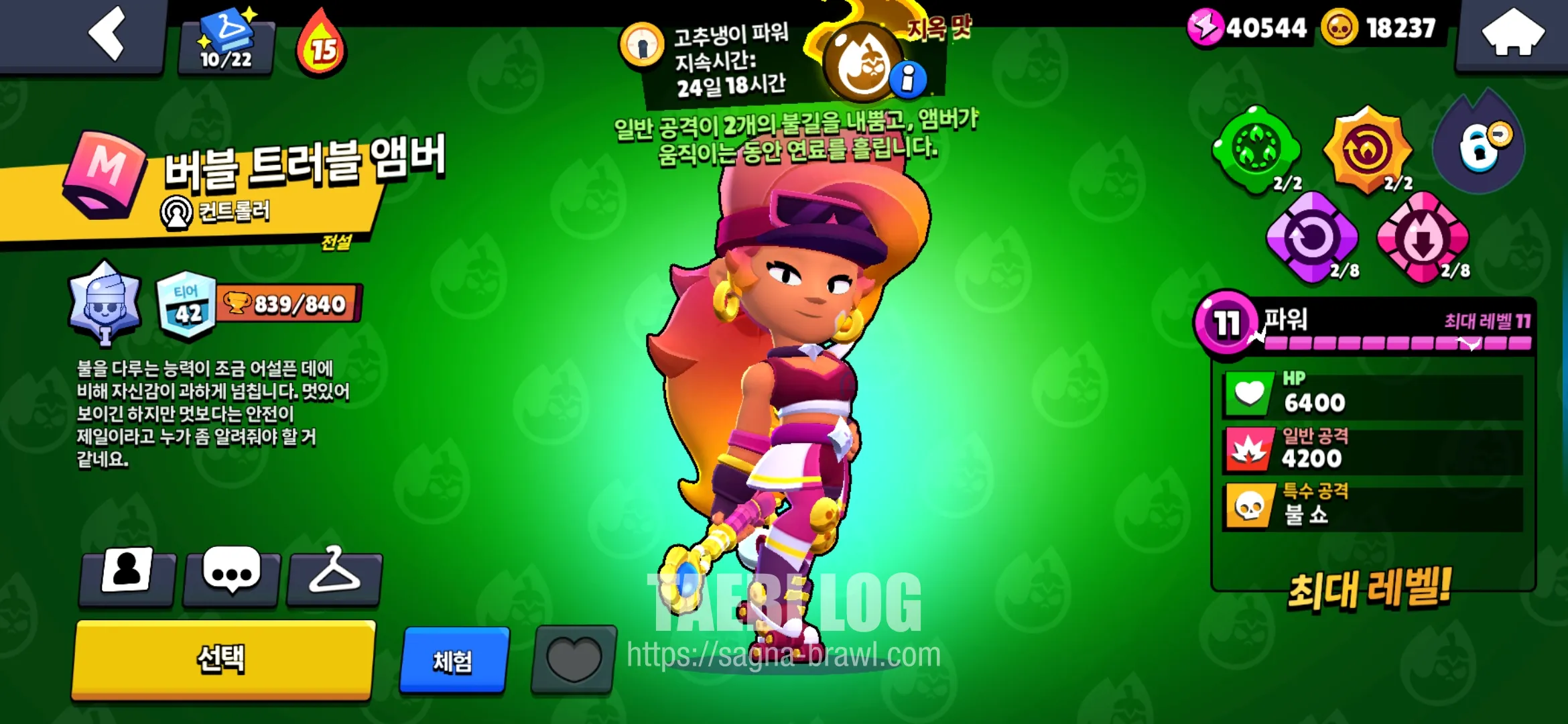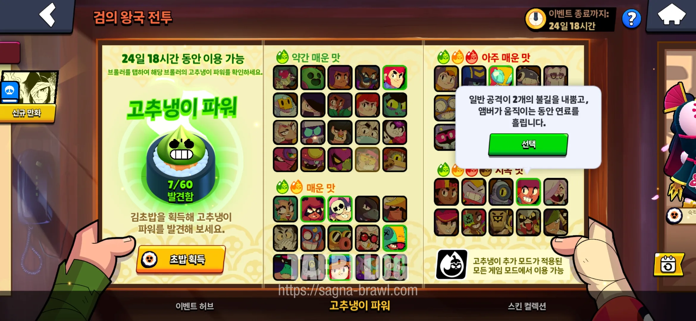 1주 차인 사무라이 스매시 맵을 진행 하면서, 한 명의 강력한 고추냉이 파워가 승패를 좌우한다는 것을 알게 되었는데요. 운 좋게 지옥맛 브롤러를 하나 얻게 되었는데, 정말 최강이라고 느껴져서 소개해 드리게 되었습니다. 그 주인공은 바로 앰버입니다.