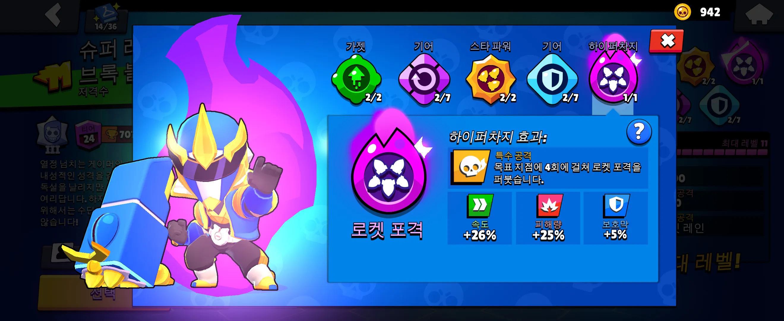 스타파워는 로켓 샤워를 장착합니다. 특수 공격 및 하이퍼차지에 강력함을 더해주는 스타파워입니다.