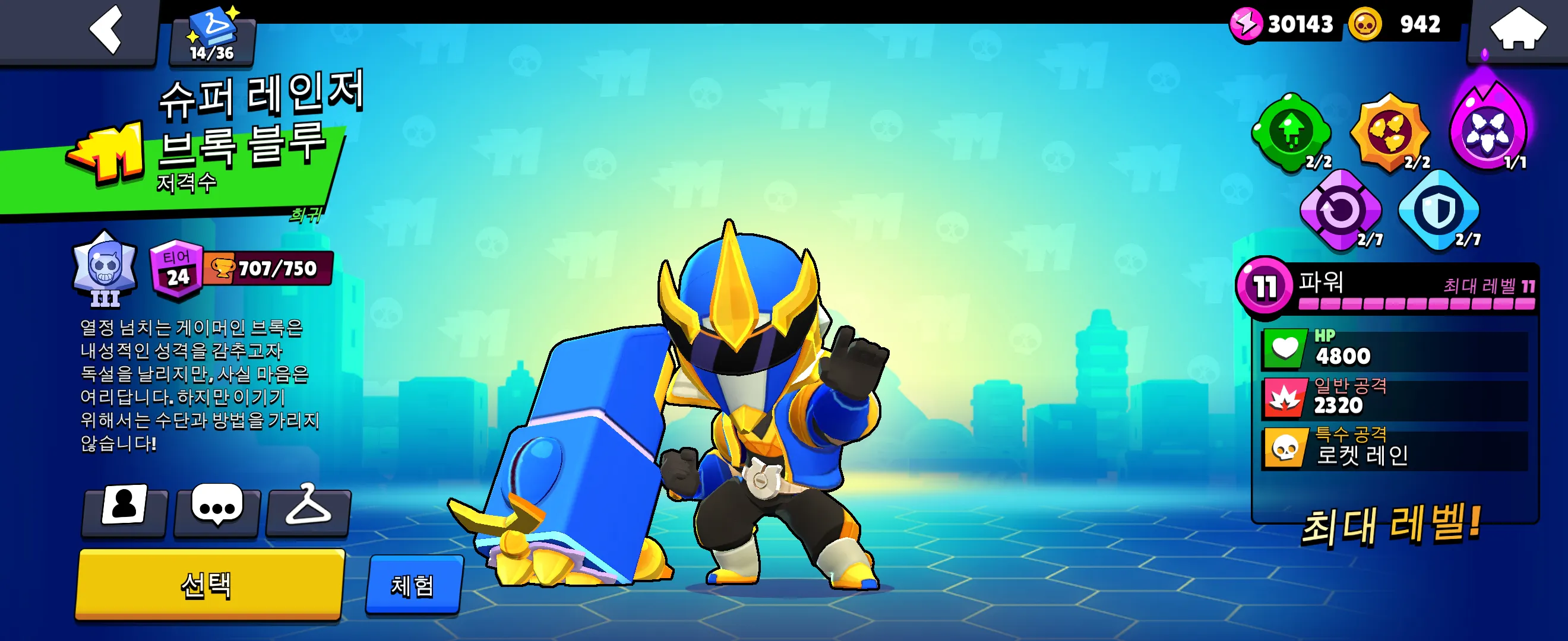 스타파워는 로켓 샤워를 장착합니다. 특수 공격 및 하이퍼차지에 강력함을 더해주는 스타파워입니다.