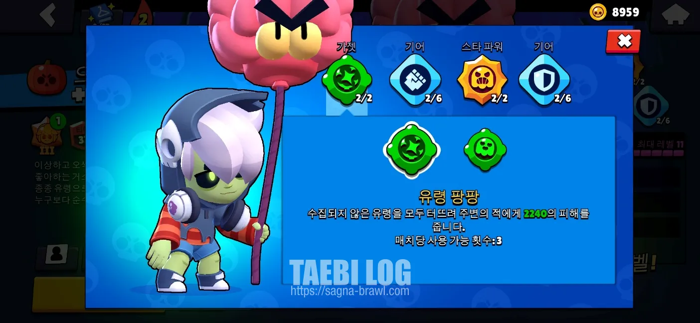 가젯은 1번 유령 팡팡을 사용합니다. 위 가젯을 사용하면, 맵에 수집되지 않은 유령을 모두 터뜨려 주변 적에게 2240의 피해를 주게 됩니다. 유령이 맵에 많으면 생각지도 못한 피해를 적팀에게 줄 수 있습니다.