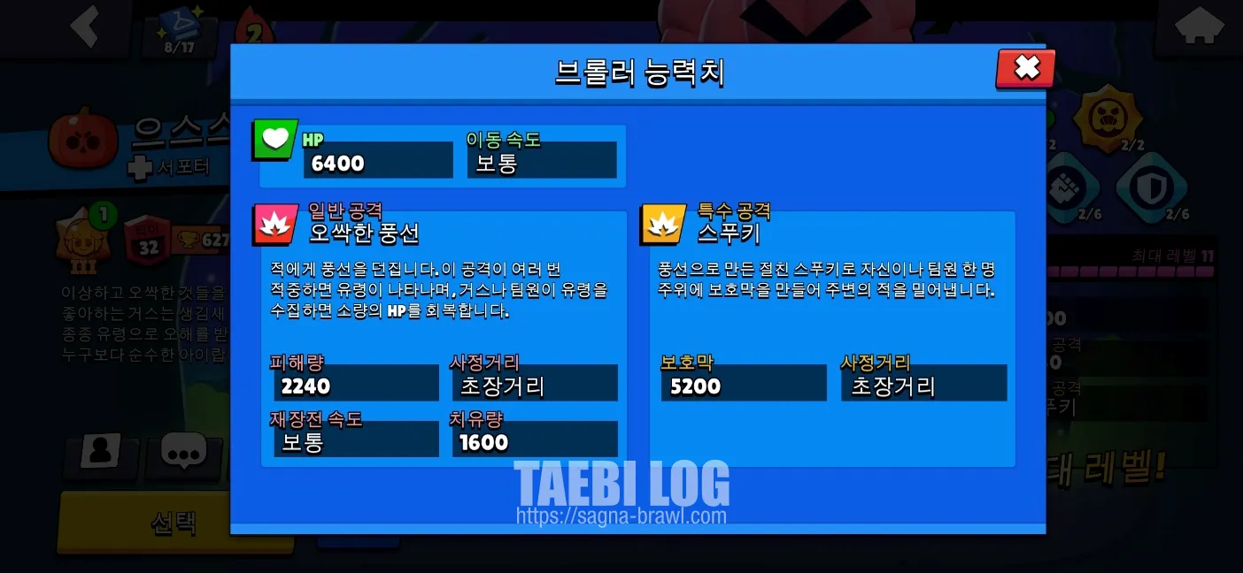 그리고 거스는 스푸키라는 유령을 생성하는데, 스푸키를 통해 자신 및 아군의 HP를 회복할 수 있고, 가젯을 사용하면 상대방을 공격할 수도 있습니다. 스푸키 활용은 가젯에서 설명드리겠습니다.