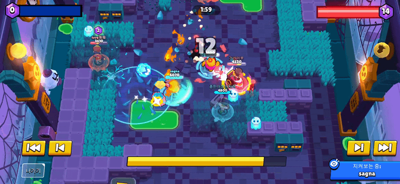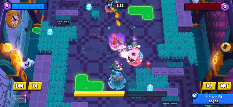위 상황에서 저는 도망가는 팽을 잡기 위해 가젯을 사용하였는데, 맵 아래쪽에 브록과 싸우고 있던 상대방 척까지 유령에 맞아 죽고 말았습니다. 유령이 터지는 범위가 꽤 넓기 때문에 상당히 좋은 효과를 보여주는 가젯이며, 한방 싸움에서 유리한 전투를 할 수 있습니다.