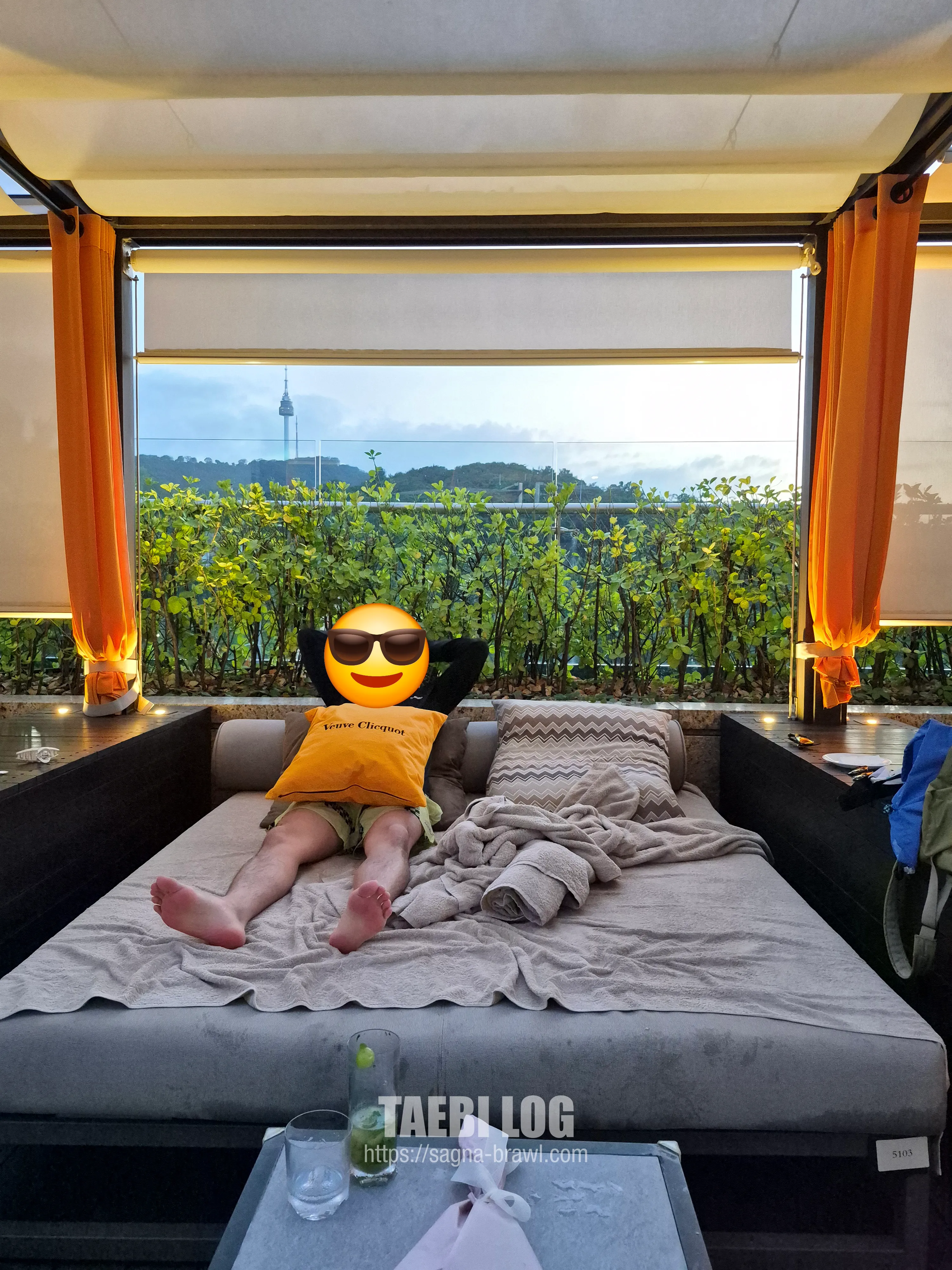 수영장 근처 선베드는 이미 만석이라, 매트리스가 있는 자리로 직원분께 추천받아 자리를 잡았습니다. 이 자리가 생각보다 너무 좋았던 게, 뒤쪽 블라인드를 올리면 너무 사진 찍기 멋진 뷰가 나옵니다. 그리고 해가 넘어갈수록 수영장 근처 자리는 햇빛이 전혀 가려지지가 않는데 비해, 매트리스 자리는 햇빛이 완전 차단돼서 누워서 쉬기 너무 좋습니다.