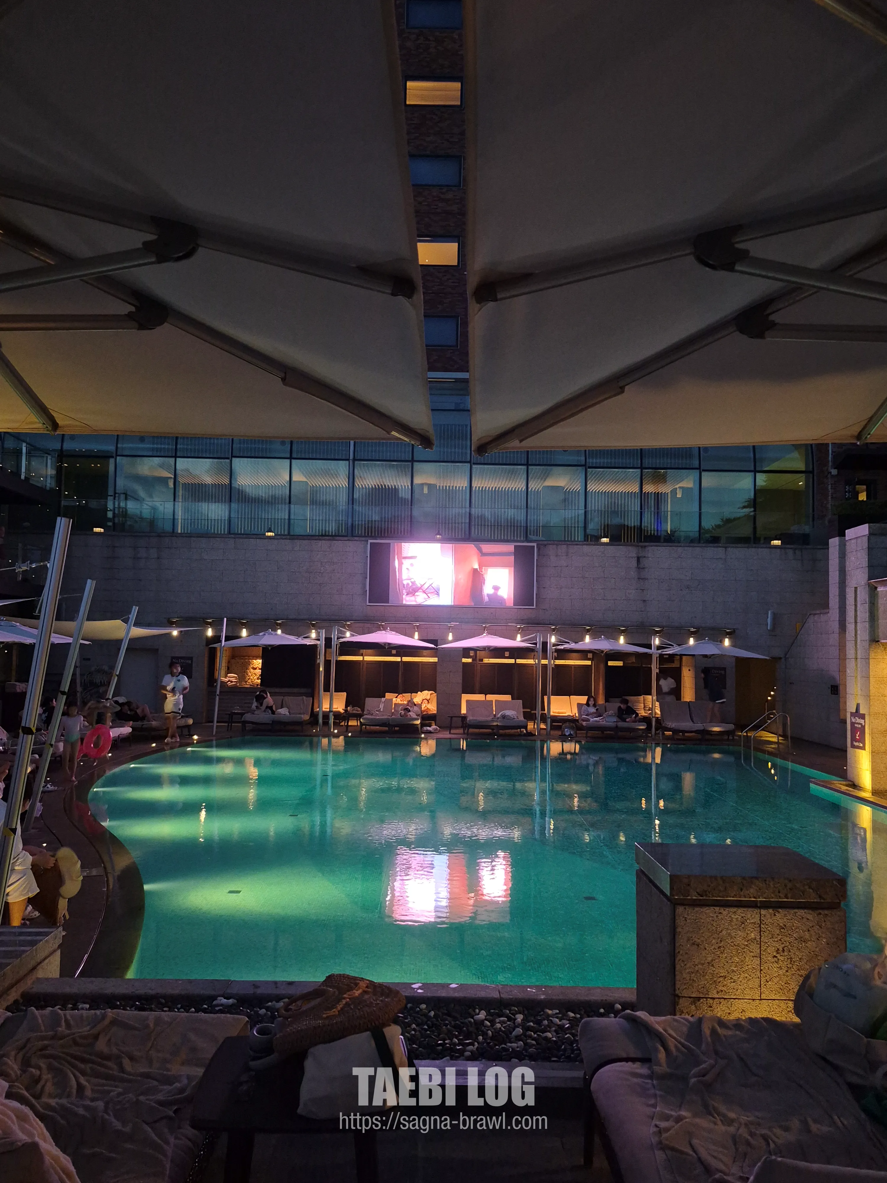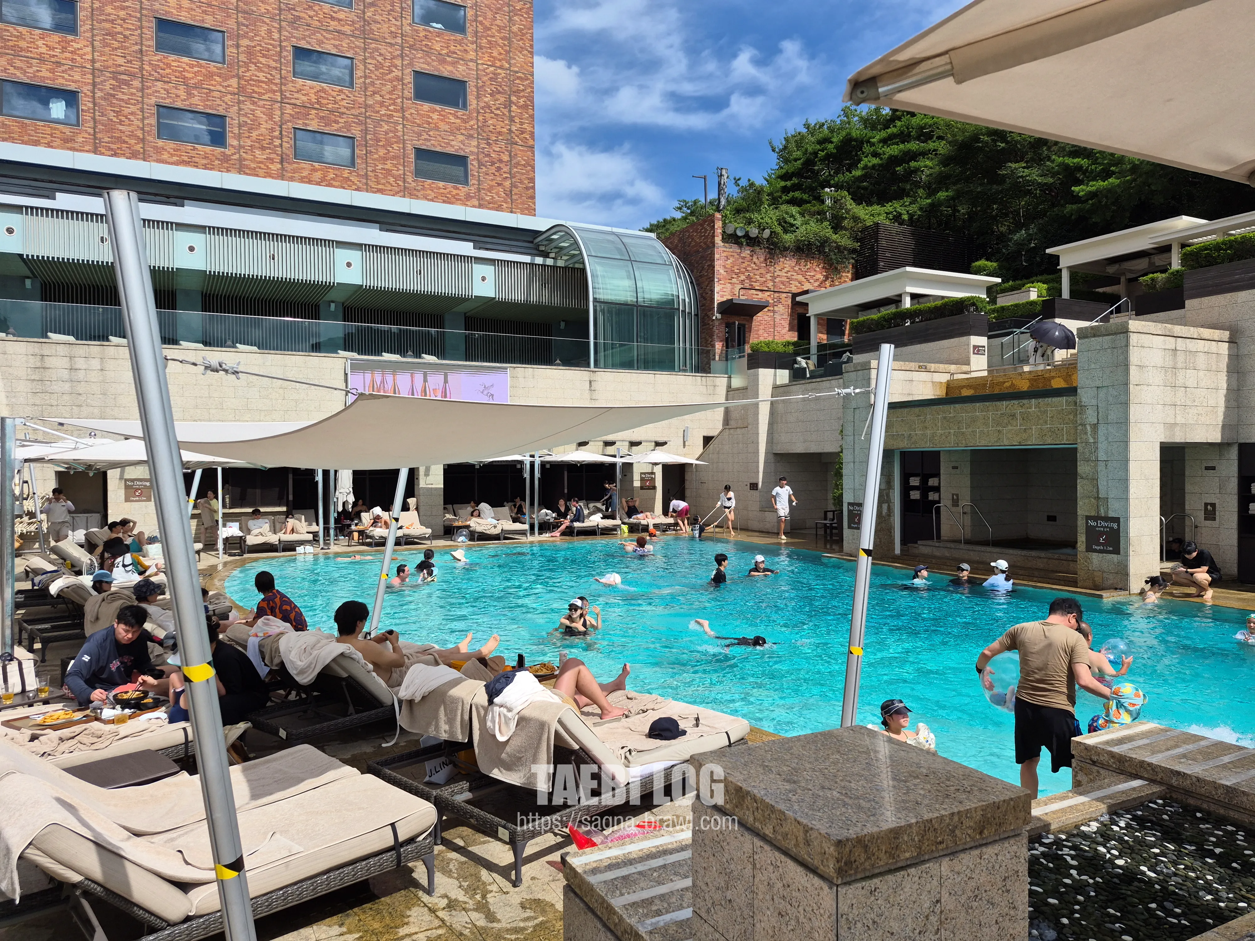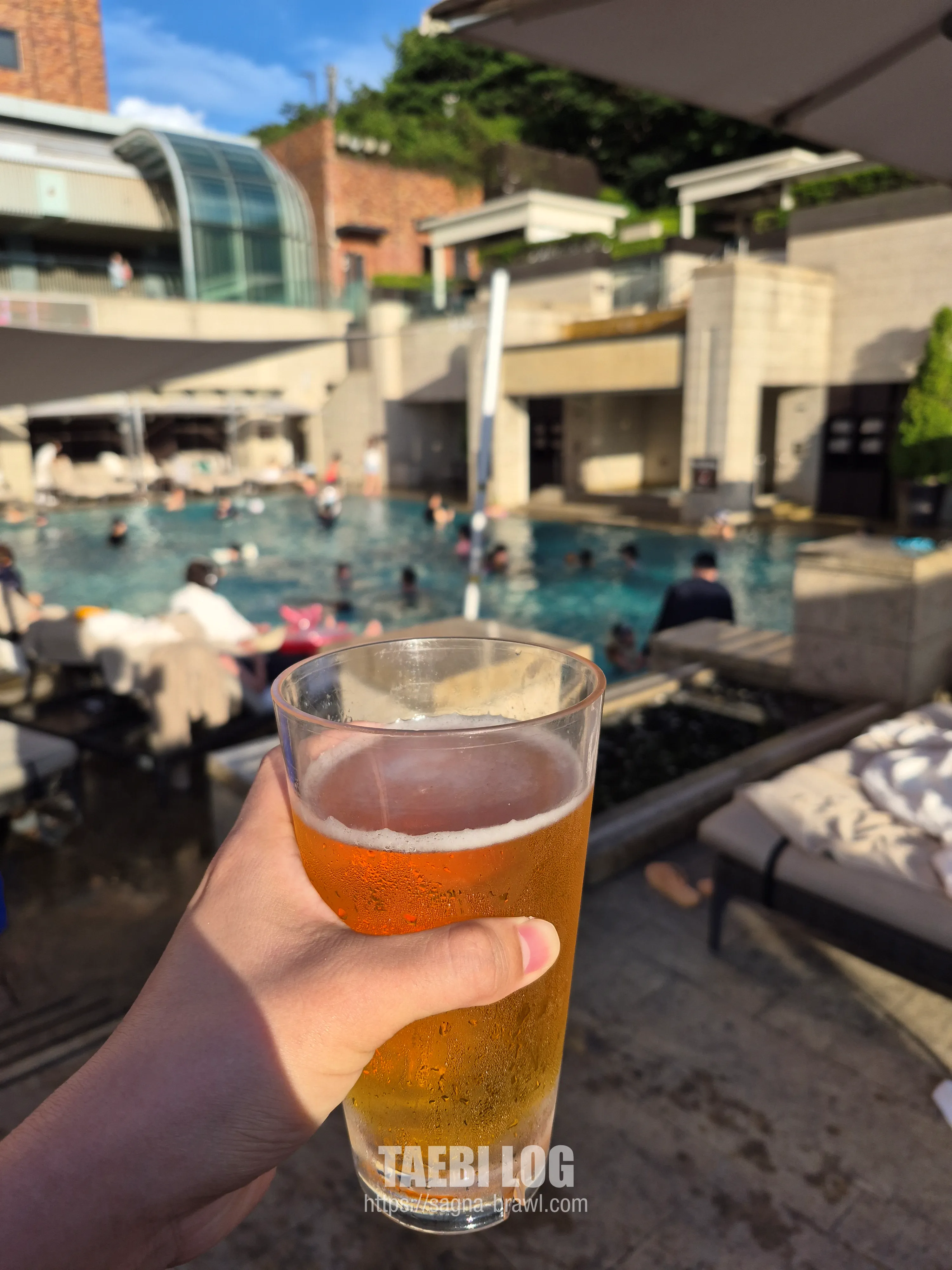 어반아일랜드 뷰를 촬영해 봤습니다. 날이 너무 좋아서 사람들이 굉장히 많았으며 물도 적당히 시원해서 수영하기 좋았습니다. 다만 1.2M 깊이로 생각보다 얕아서 본격적인 수영을 하고 싶은 분들은 실내 수영장으로 가시는 것을 추천드립니다. 여기서는 물놀이를 하면서 맥주도 마시고, 편안하게 쉬는 것을 추천드립니다.