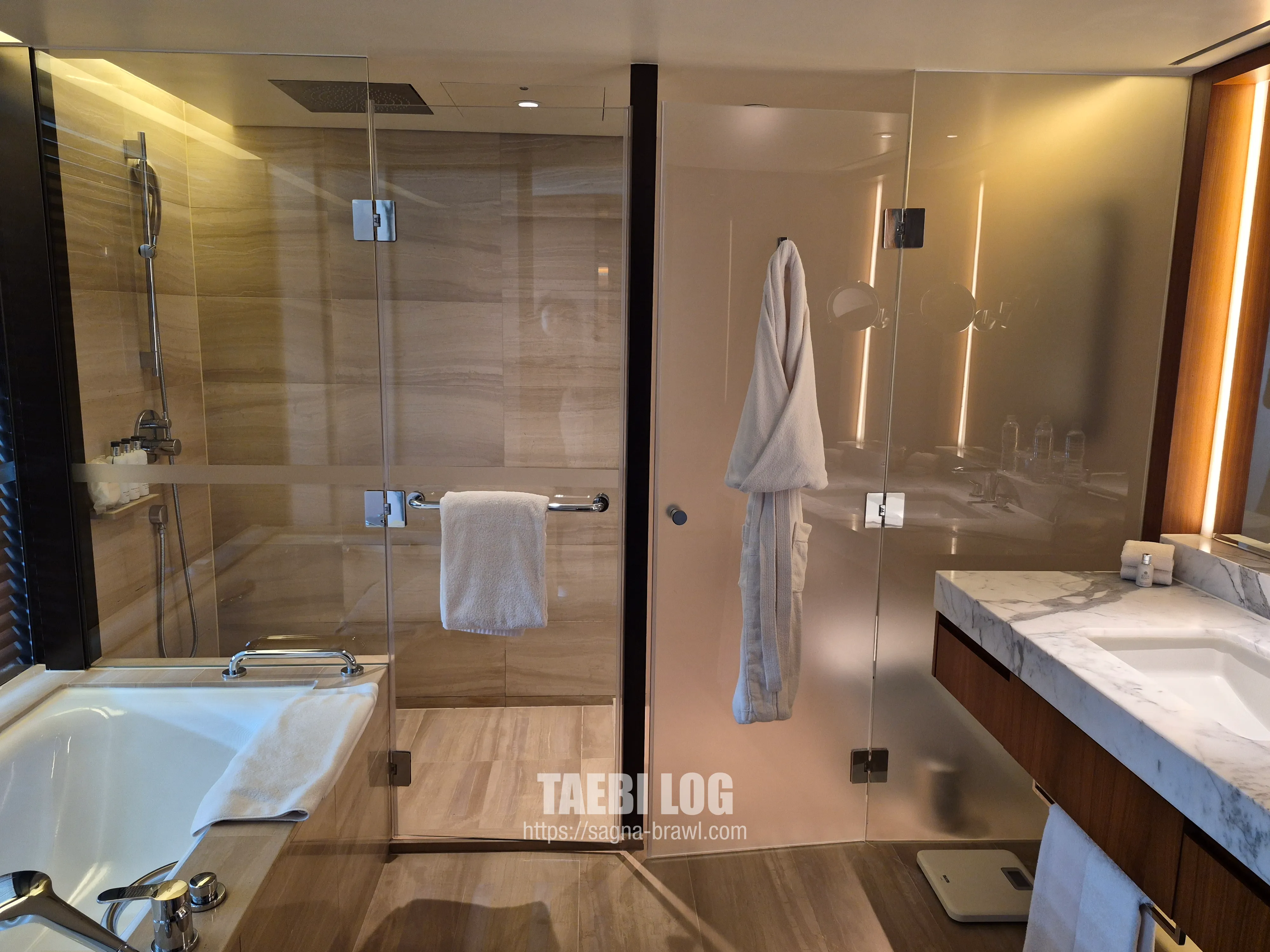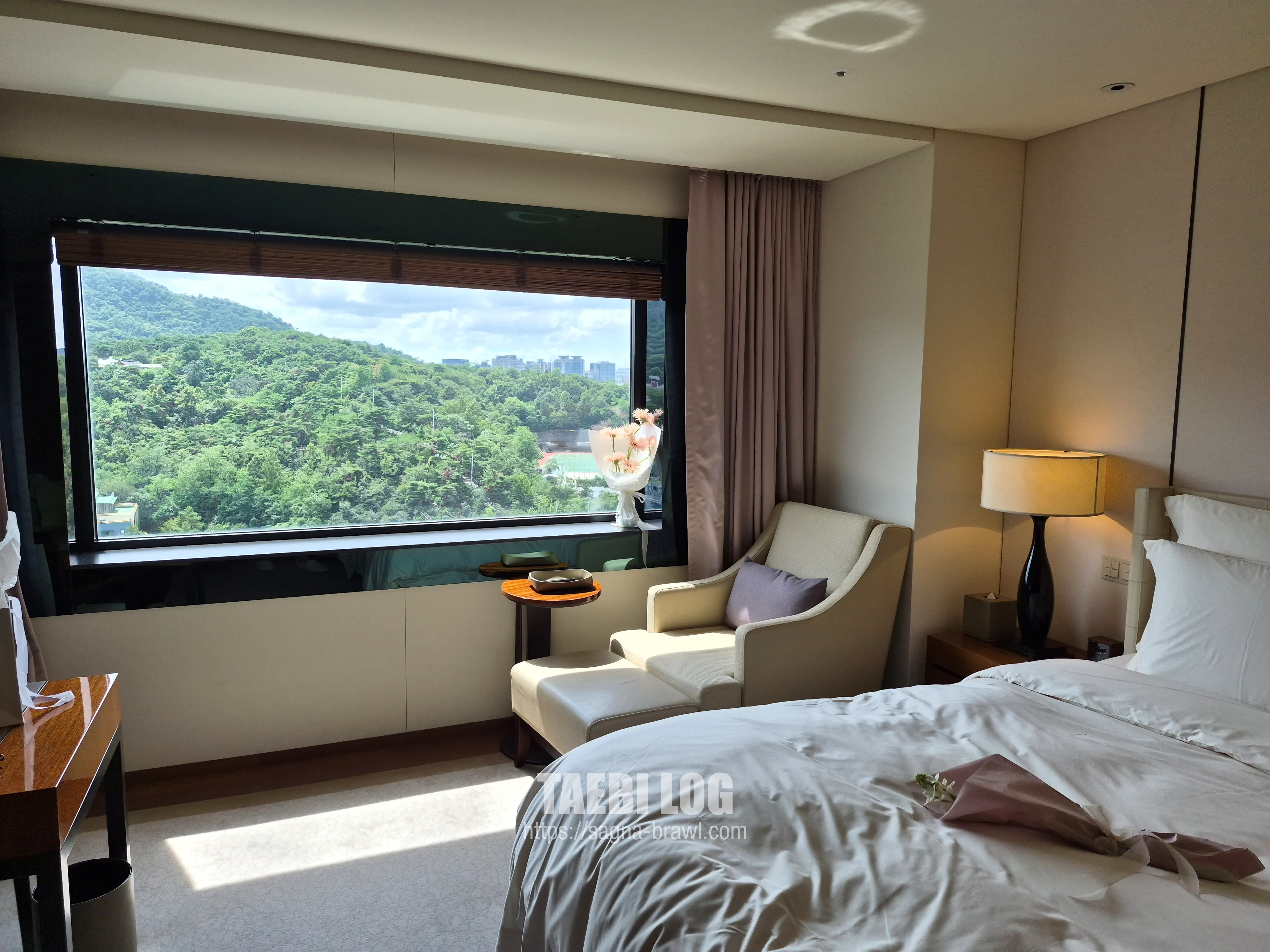 저는 남산뷰 객실을 배정받아 올라갔습니다. 통창으로 보이는 남산뷰가 정말 그림 같습니다. 창문으로 내려다보면 어반아일랜드가 바로 보이는데, 두시에 일찍 체크인해서 올라갔는데도 벌써 사람이 많아 보입니다. 화장실도 널찍하고 욕조도 있습니다.