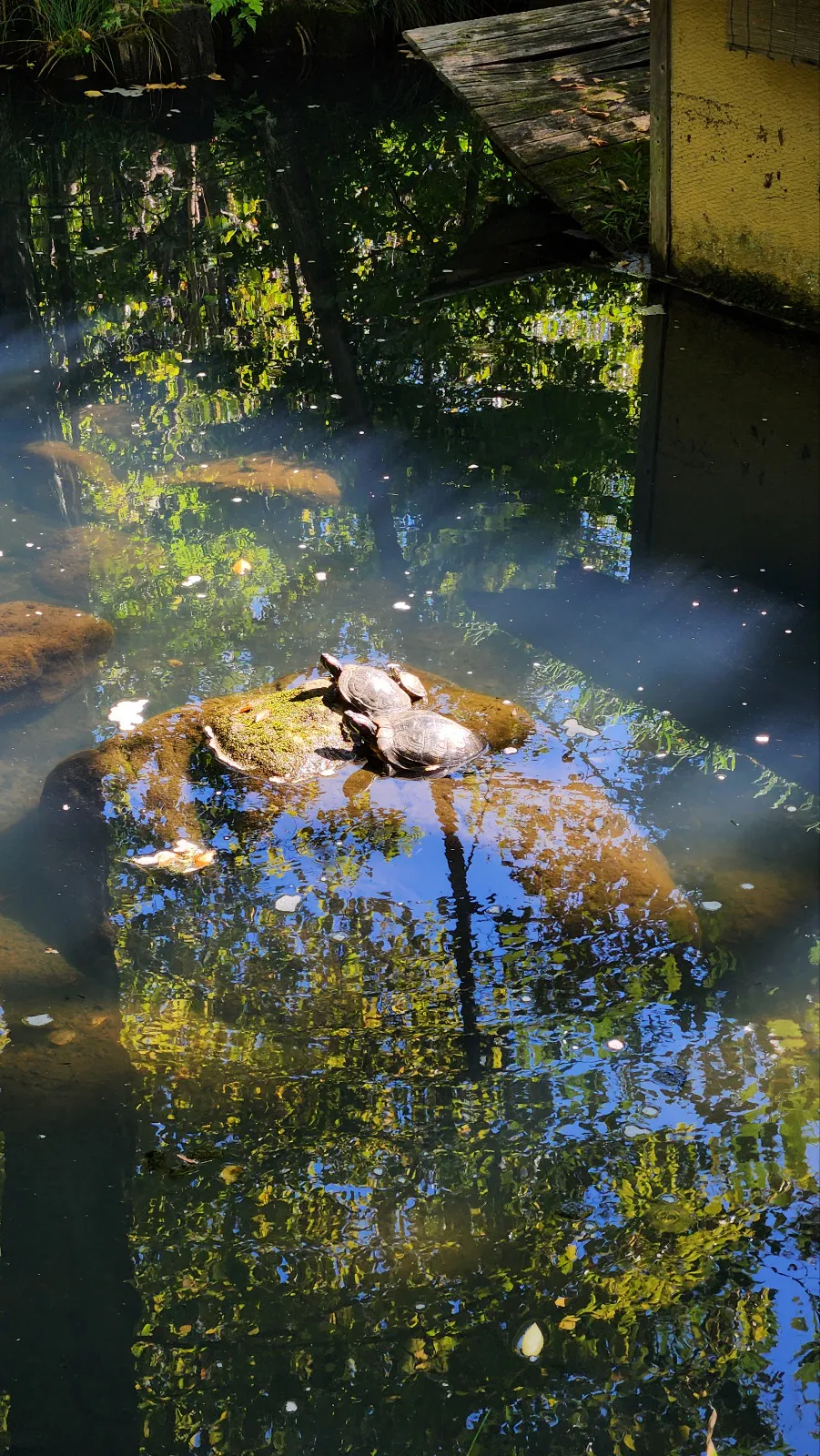 정원에 있는 연못에서 거북이 가족이 일광욕을 즐기는 모습도 발견하였습니다.