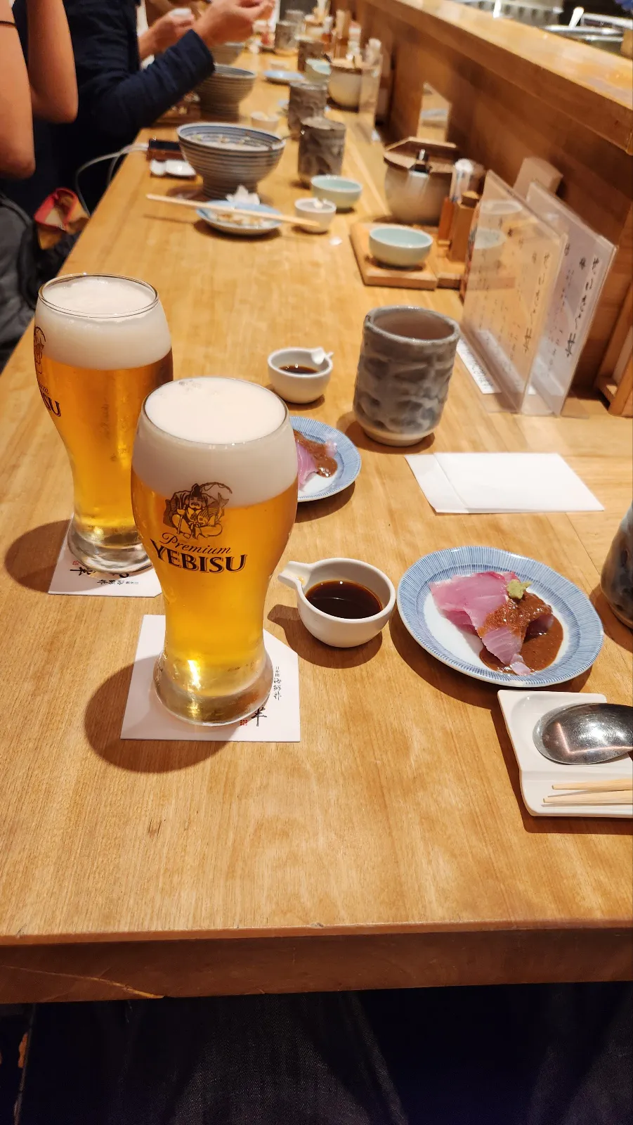 먼저 도미회 4점과 노른자 간장이 나옵니다. 간장에는 고추냉이를 적당히 풀어주고, 에비수 생맥주를 무조건 시켜줘야 합니다. 회와 카이센동도 맛있지만, 에비수 생맥주가 엄청나게 맛있습니다.