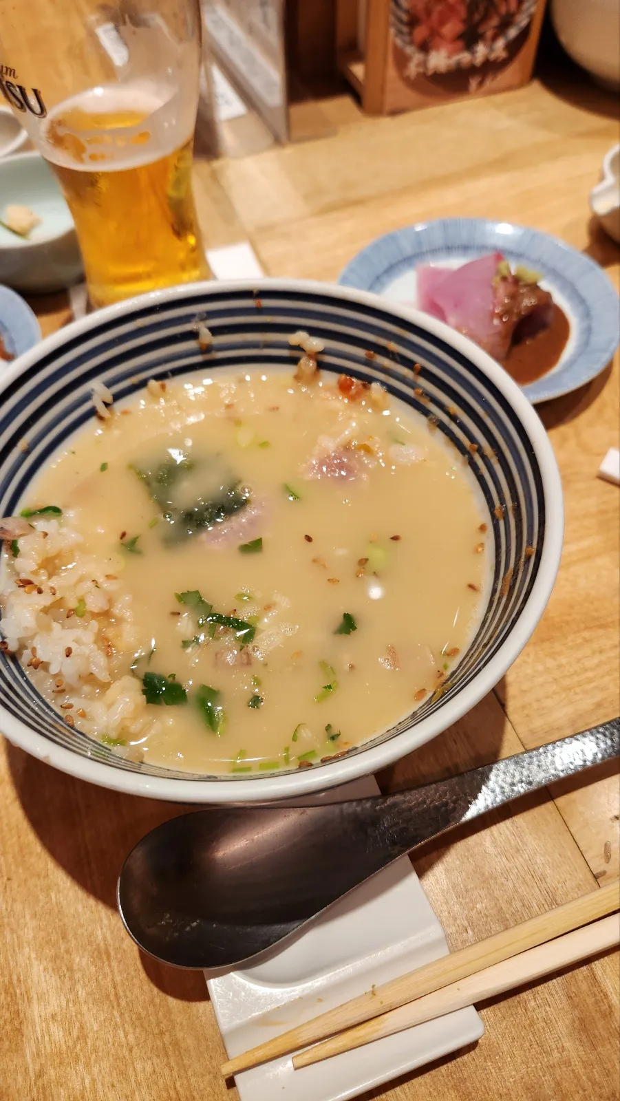 저 도미육수를 부으면 더 맛있어집니다. 우리나라의 국밥 먹는 느낌이 나면서, 뭔가 말로 표현할 수 없는 엄청난 맛입니다. 사진의 비주얼이 좀 별로일 수는 있는데, 정말 맛있습니다. 에비수와 먹으면 극강의 맛입니다. 우리나라였다면 이모~ 소주 한 병 더요~ 무조건 나옵니다.