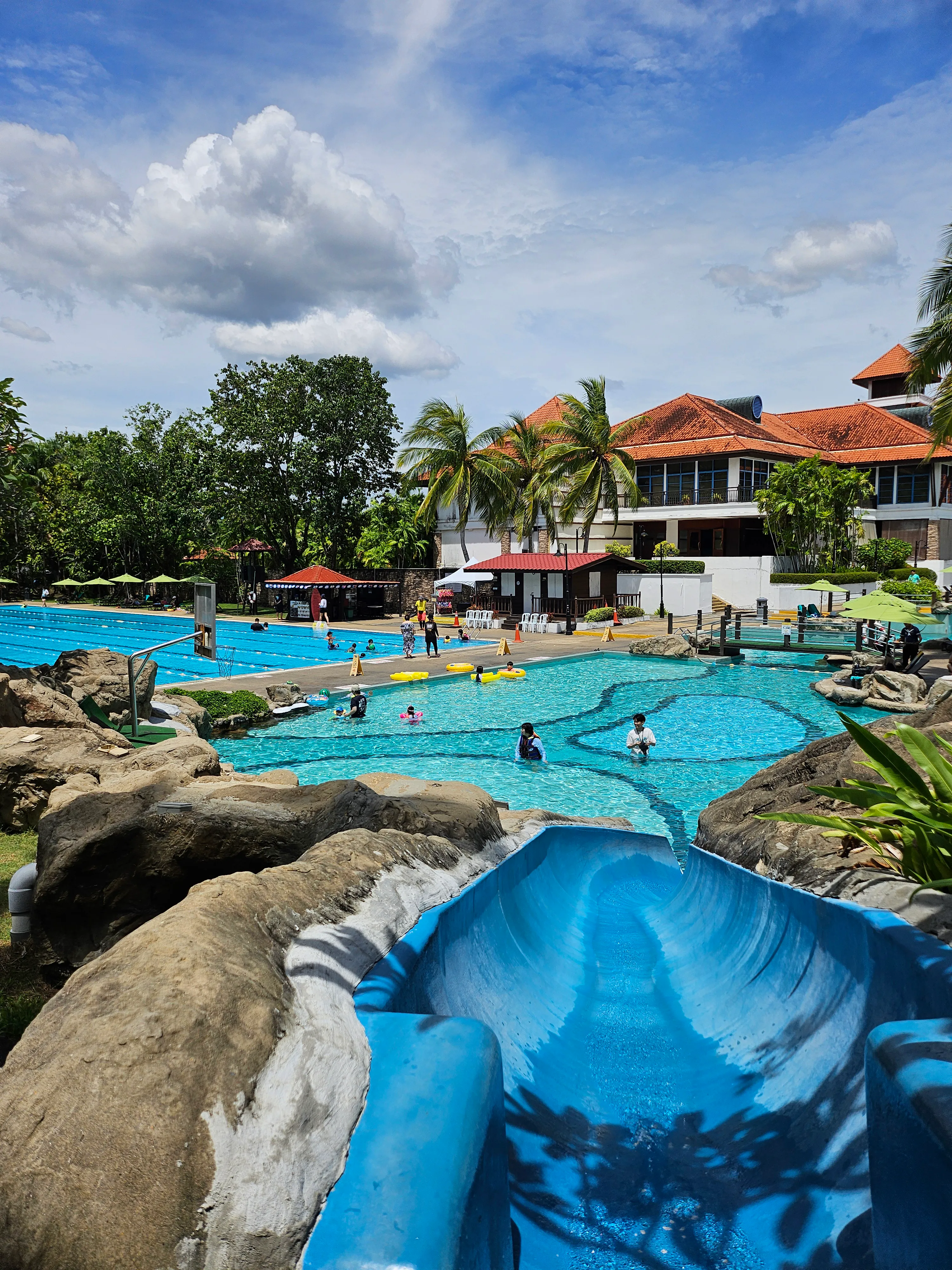50M 레인뿐 아니라 어린이 수영장 및 워터슬라이드 수영장도 있습니다. 위 사진이 워터슬라이드 타기 직전 수영장 View를 찍은 사진인데, View가 너무 아름답습니다.