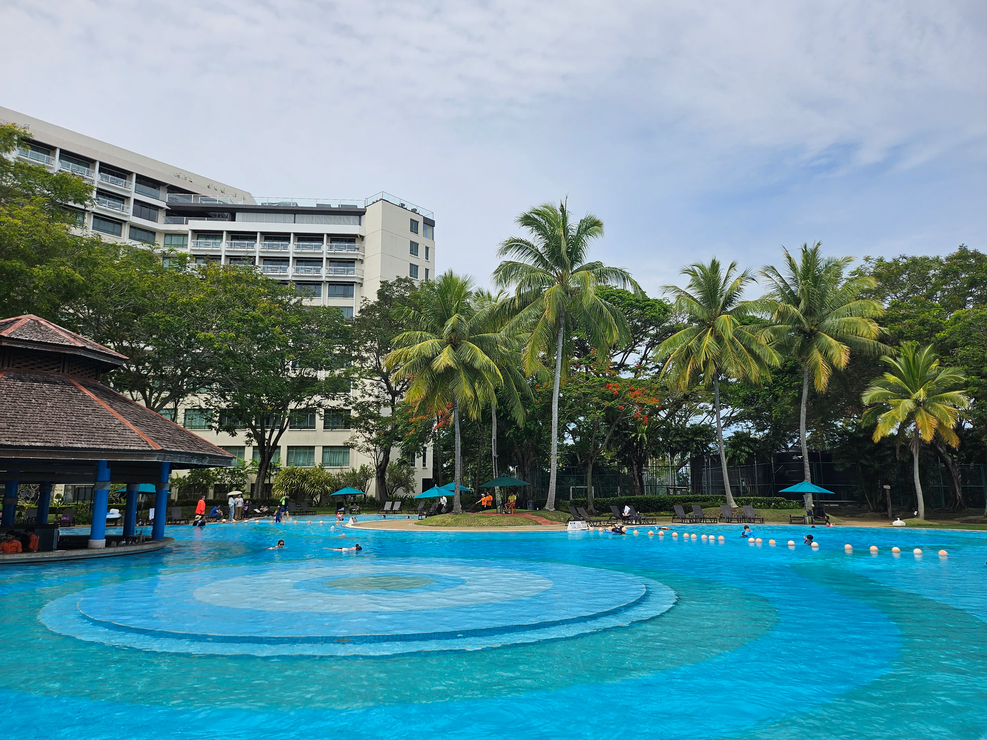 다음은 퍼시픽 수트라 수영장입니다. 가운데 원형 모양 부분이 수심이 엄청 낮고, 그 외 부분은 수심이 원의 중심에서 멀어질수록 깊어집니다.(최대 150cm) 수영을 하기는 역시 쉽지 않고, 물놀이하기 좋습니다.