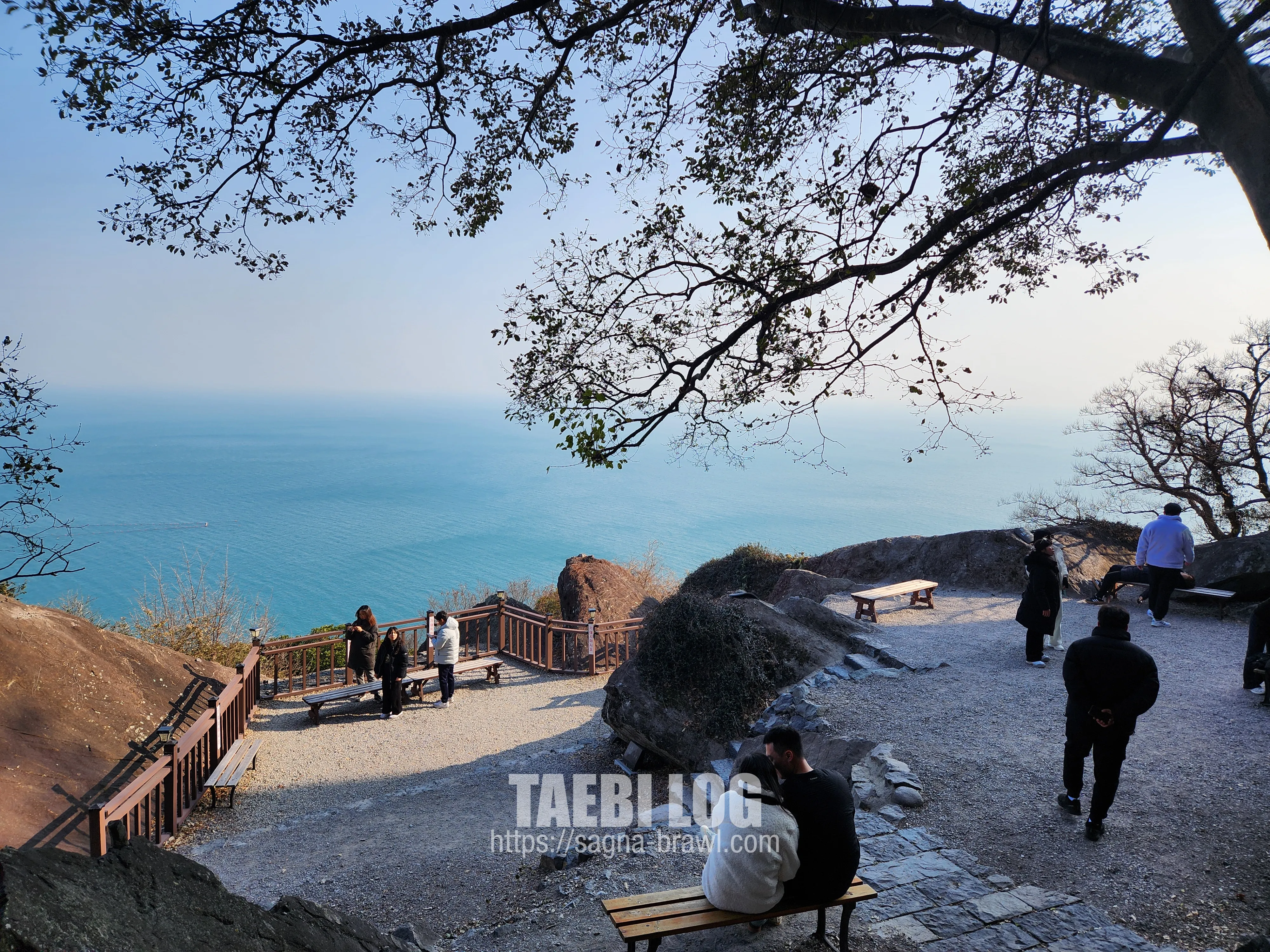 향일암에 도착하게 되면 사찰이 나오게 되고, 사찰에서 보이는 바다뷰가 상당히 멋있습니다. 가슴이 뻥 뚫리는 듯한 바다뷰입니다. 위 사진은 향일암을 등지고 우측 방향의 바다를 찍은 사진입니다. 사찰과 나무, 바다가 어우러져서 굉장히 멋있는 사진이 찍혔습니다.