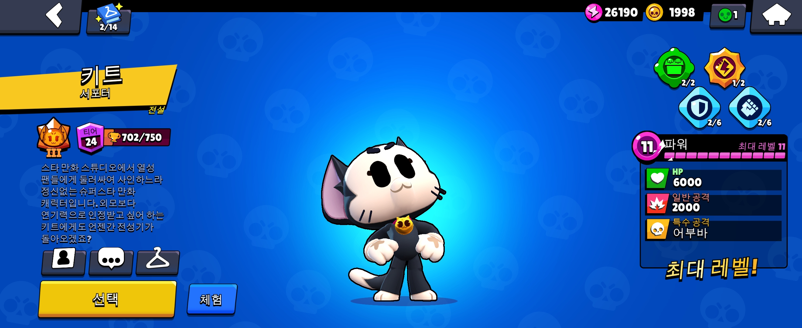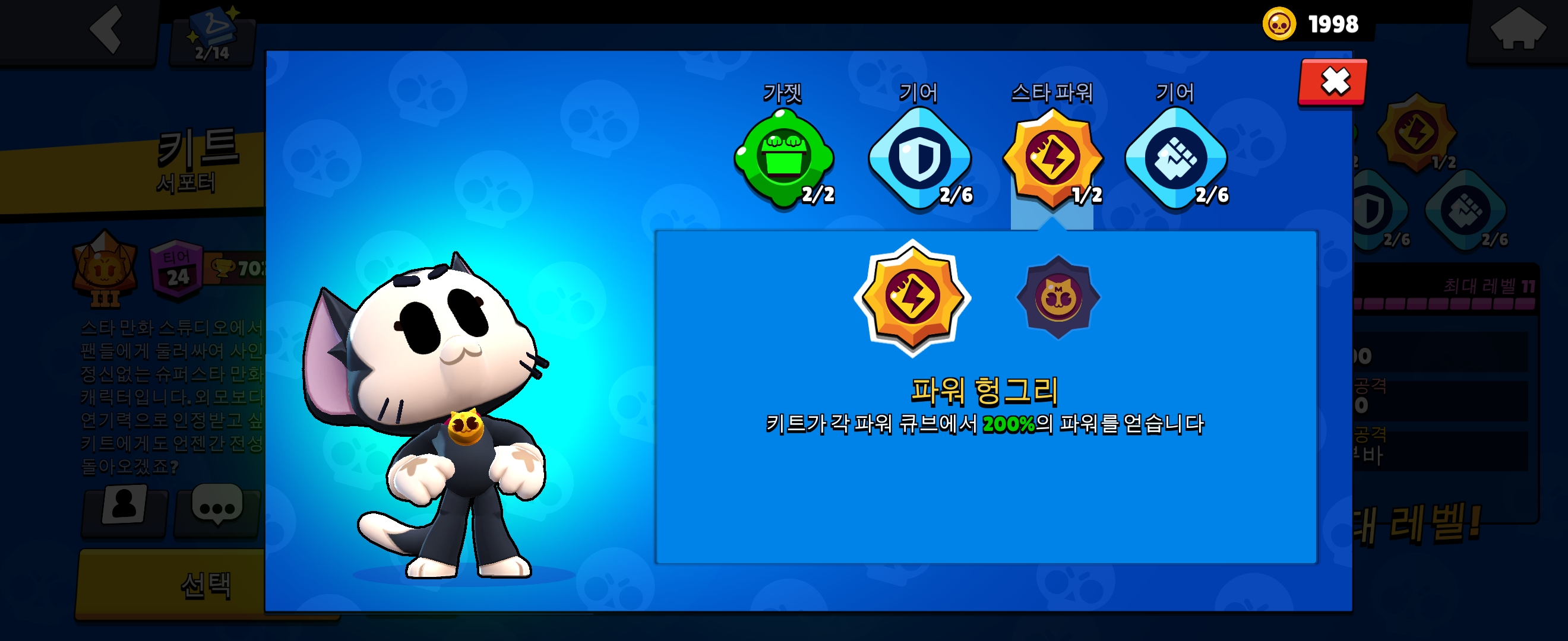 그런데 키트는 1번 스타파워를 통해, 파워 큐브당 체력 800, 공격력 20%를 얻게 됩니다. 파워큐브를 많이 먹을수록 사기적으로 강해진다는 뜻입니다.