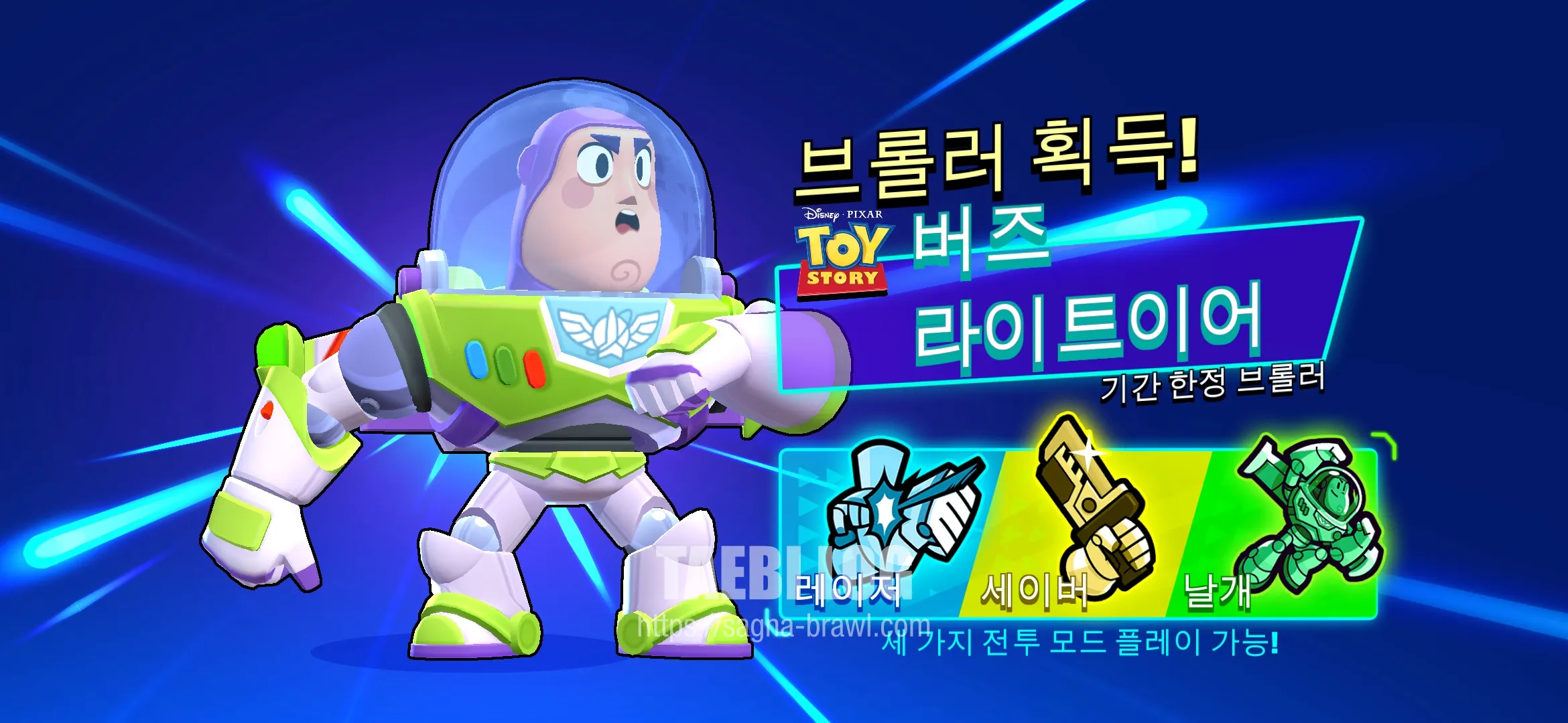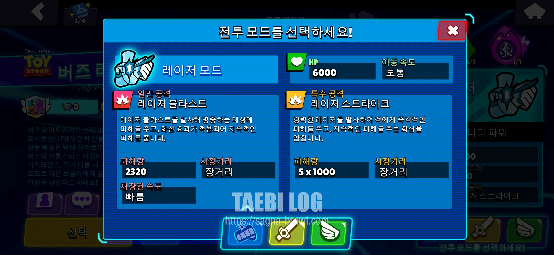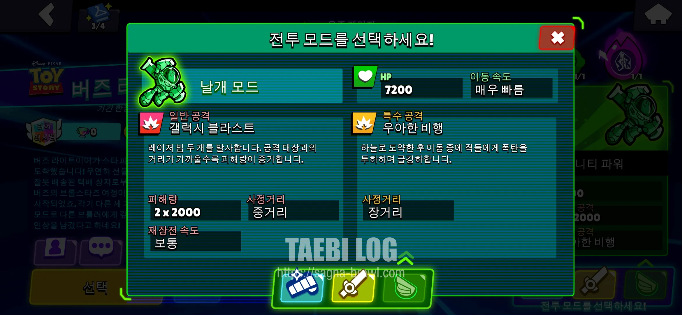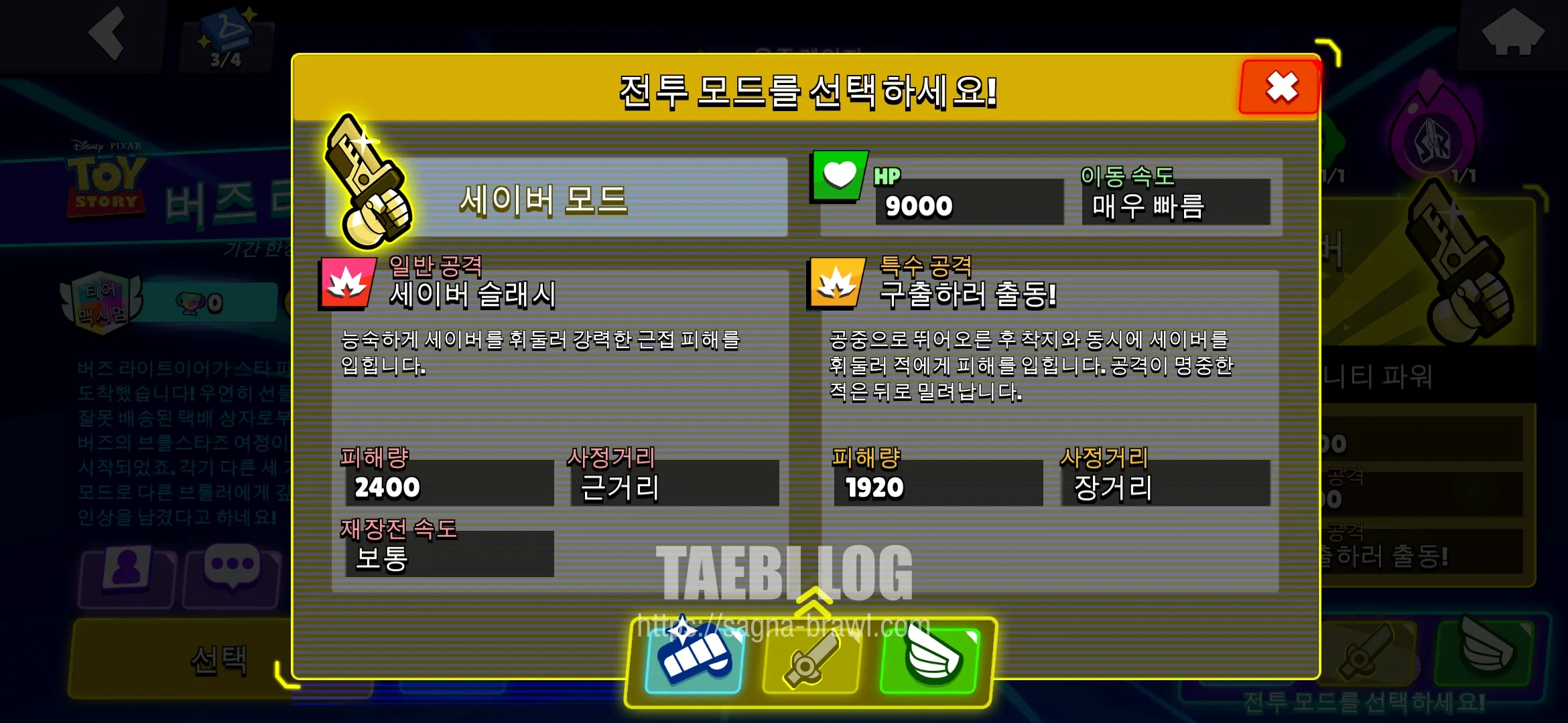 버즈 라이트이어는 위에서 말씀 드린 것처럼, 세 가지 전투 모드를 설정할 수 있습니다. 마치 세 개의 브롤러 역할을 하는 것인데요. 레이저 모드, 세이버 모드, 날개 모드가 있습니다. 각각의 전투 모드에 대해 분석해 보도록 하겠습니다.