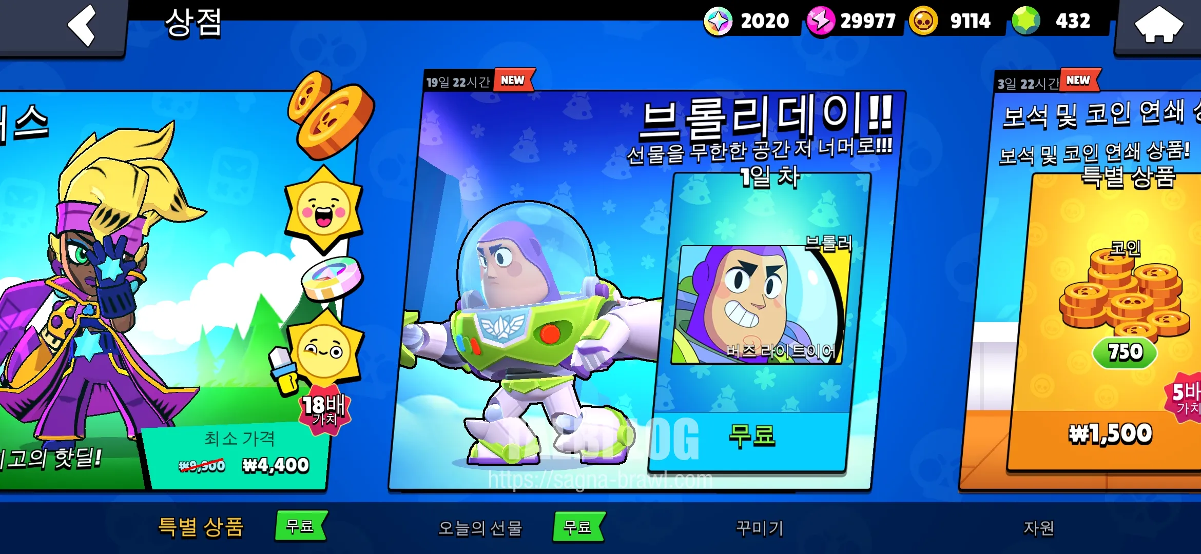 브롤스타즈에 접속하면, 상점에 위와같이 브롤리데이!! 선물로 버즈 라이트이어를 무료로 받을 수 있습니다.