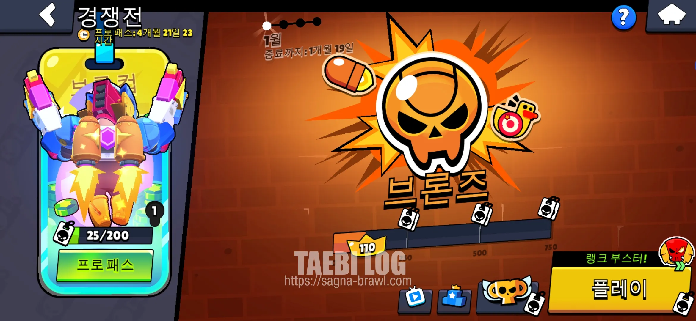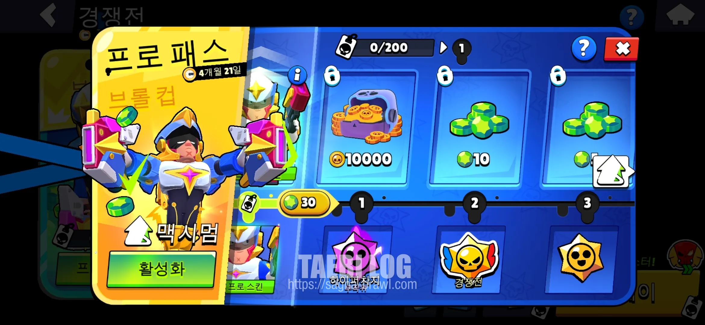 먼저 경쟁전에 프로 패스라는 진행 시스템이 도입되었습니다. 브롤 패스와 유사한 진행 시스템으로 유료와 무료가 있습니다. 첫 보상에 하이퍼차지가 보여서 상당히 맘에 들었습니다.