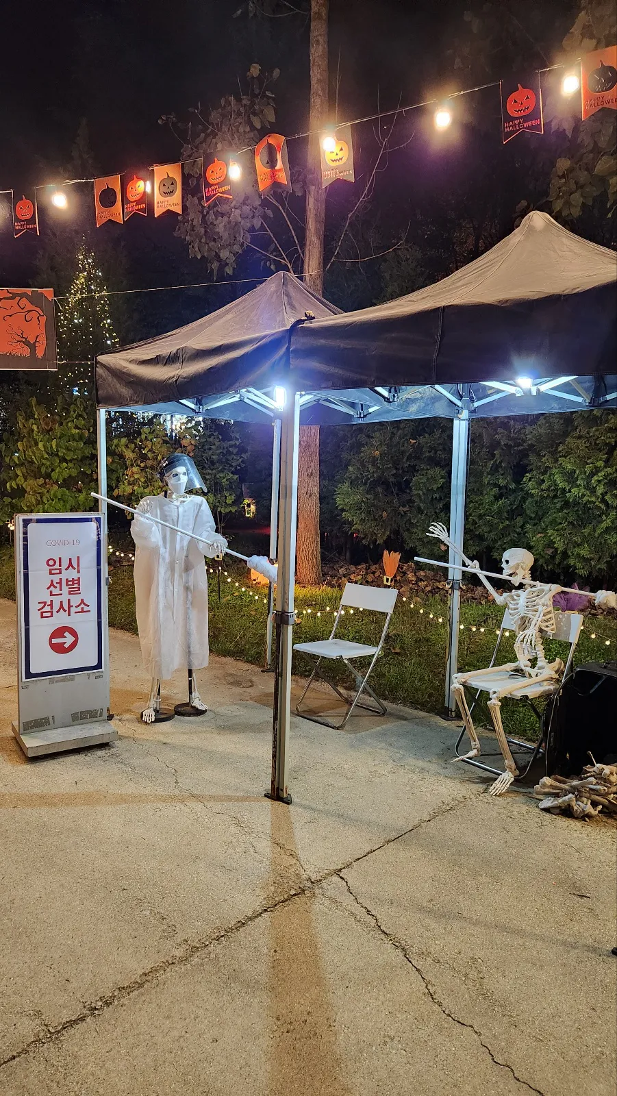 처음에 들어가면 할로윈 해골들이 임시 선별 검사소에서 저희를 맞이해 줍니다. 지금은 코로나가 끝났지만, 과거의 씁쓸했던 모습을 보는 듯하였습니다.
