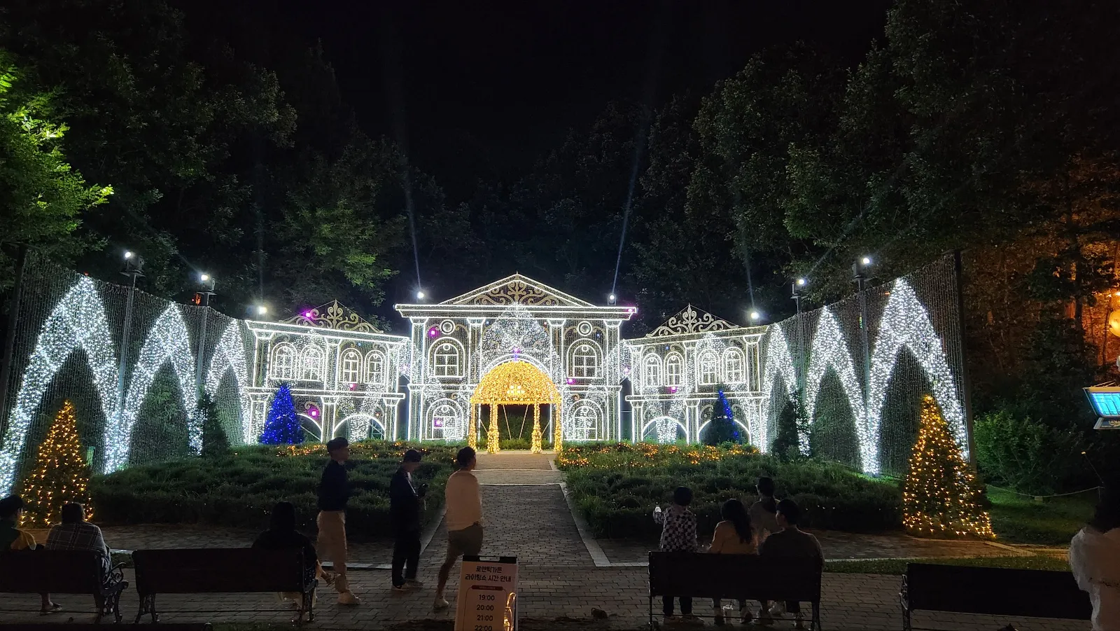 별빛정원우주 중앙에는 매시 정각에 라이팅쇼를 진행하는데, 앉아서 관람할 수 있게 벤치도 마련되어 있습니다.