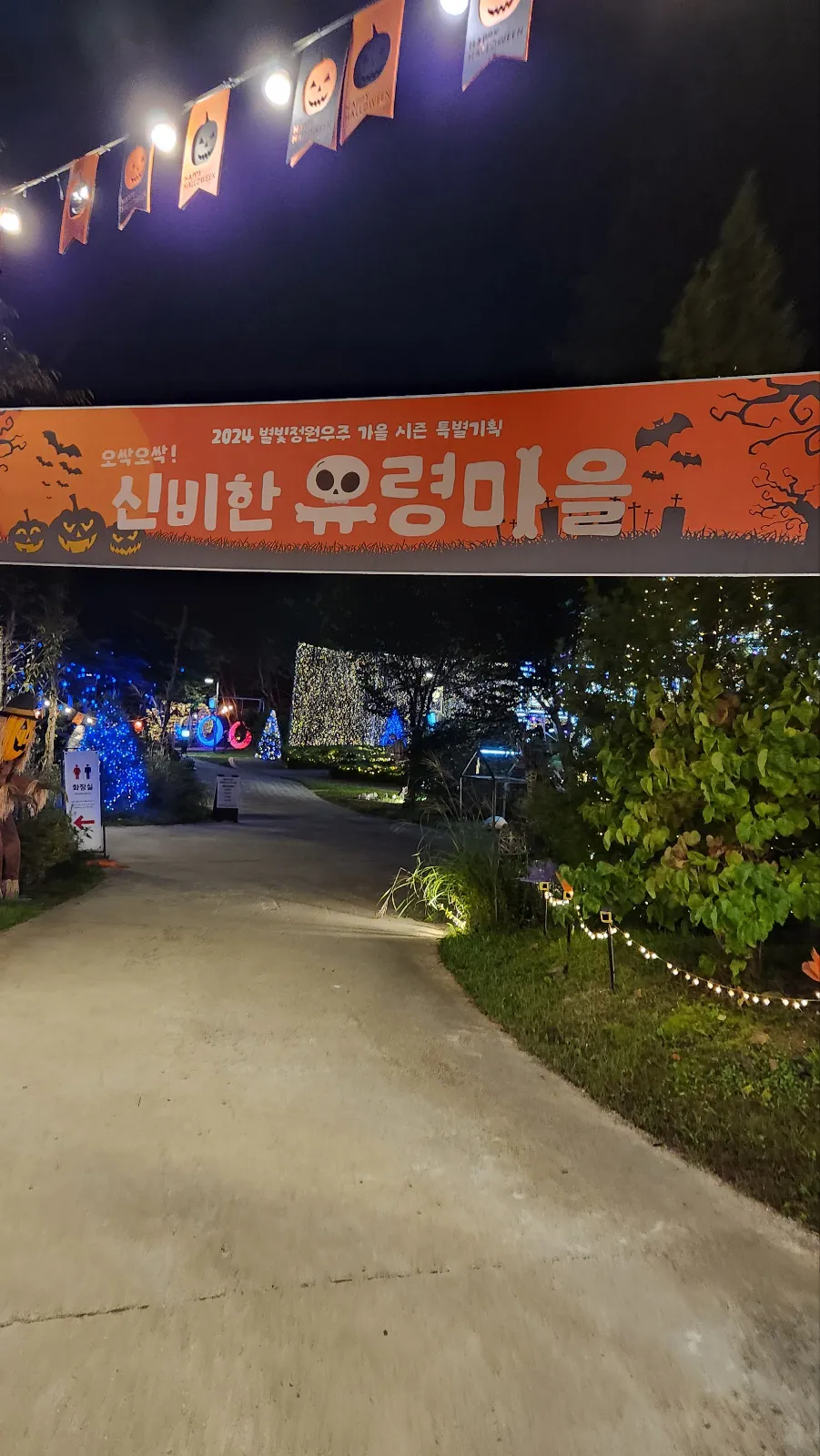 임시 선별 검사소를 지나면, 아래와 같이 2024 가을 시즌 특별기획 "오싹오싹! 신비한 유령마을" 현수막이 걸려 있습니다. 할로윈을 맞이하여 유령마을로 꾸며놓은 것으로, 임시 선별 검사소에서 해골들이 저희를 맞이해 준 것이 이해가 되었습니다.