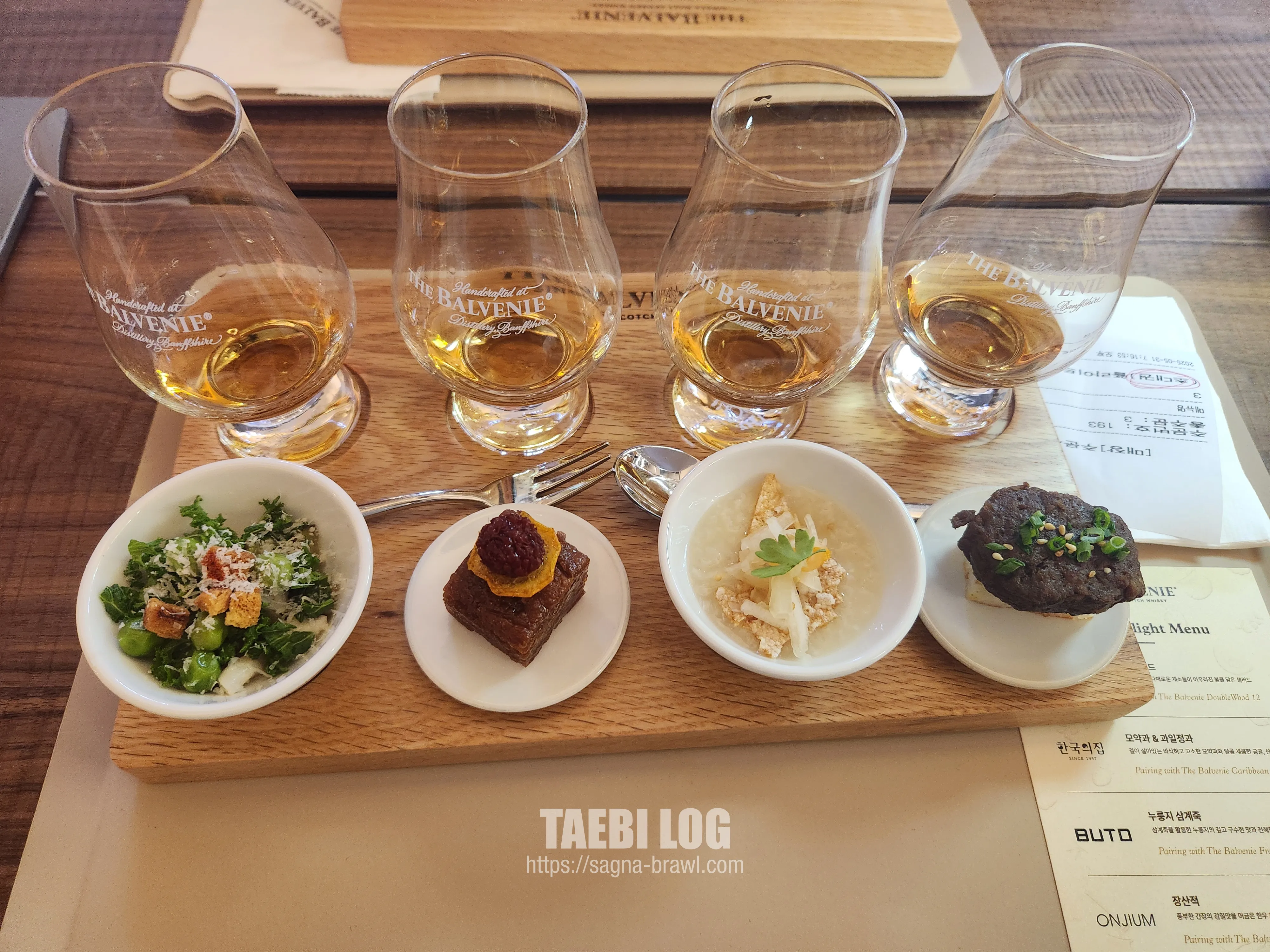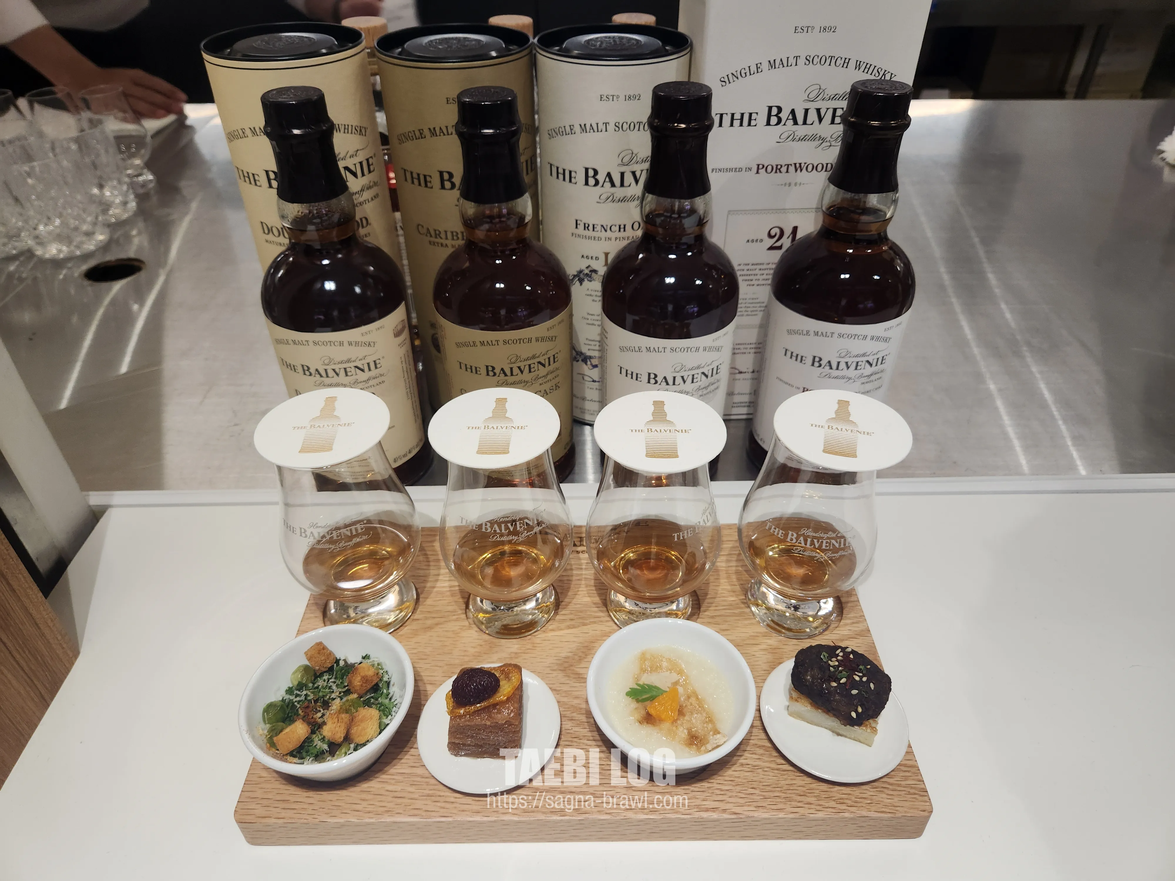 직접 받은 페어링 플라이트 모습입니다. 왼쪽부터 12, 14, 16, 21 및 발베니 메이커스 셰프들의 핑거푸드 모습입니다.