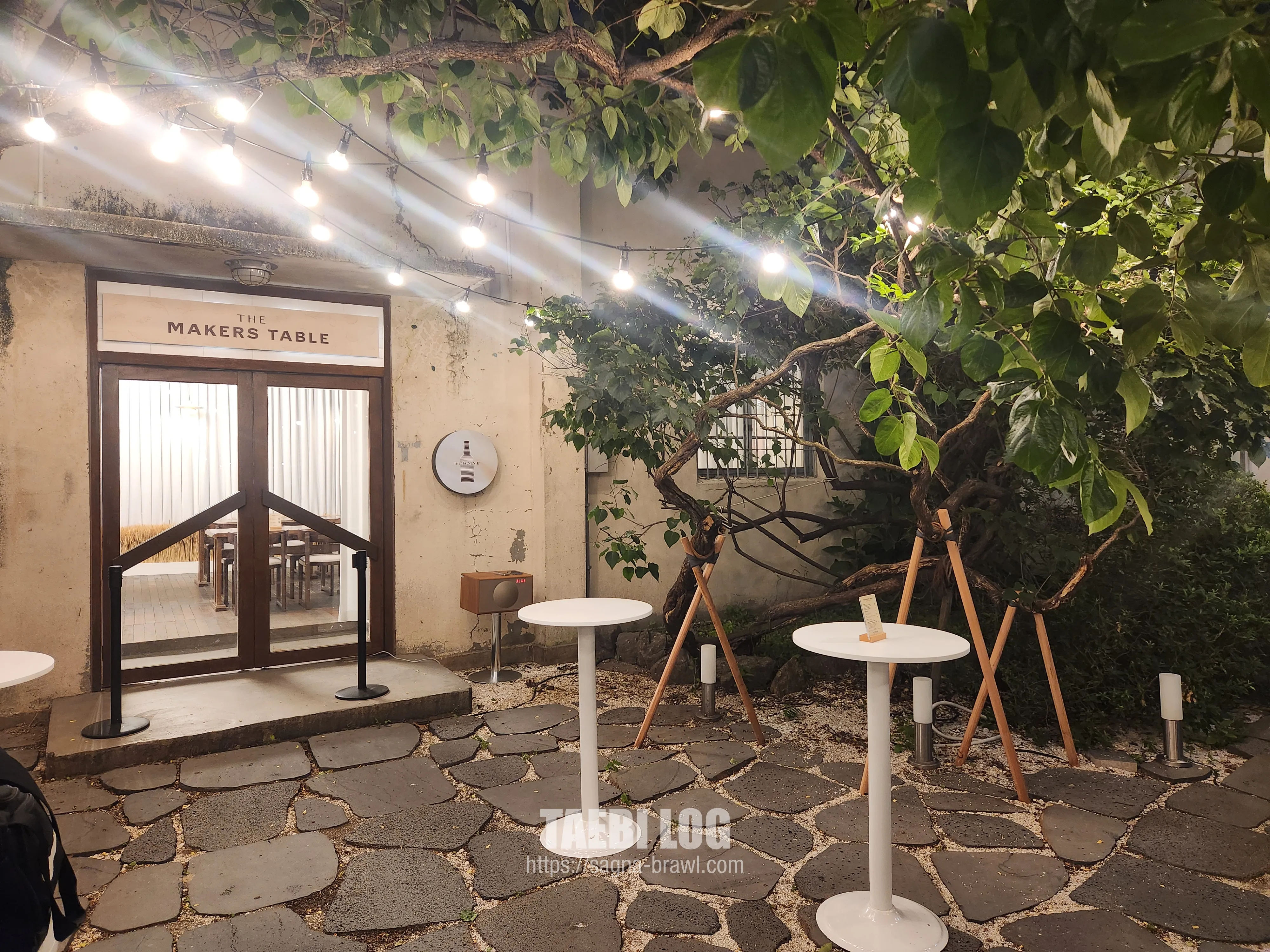 팝업스토어 장소에 가시면 큰 건물 두 개가 있는데, 왼쪽 편이 전시관, 오른쪽이 페어링 BAR입니다. 저는 저녁 7시쯤에 방문해서 먼저 전시관에 들어갔는데요. 아래 사진은 페어링 세트까지 다 먹고 나와서 찍은 메이커스 테이블 입구 사진입니다.