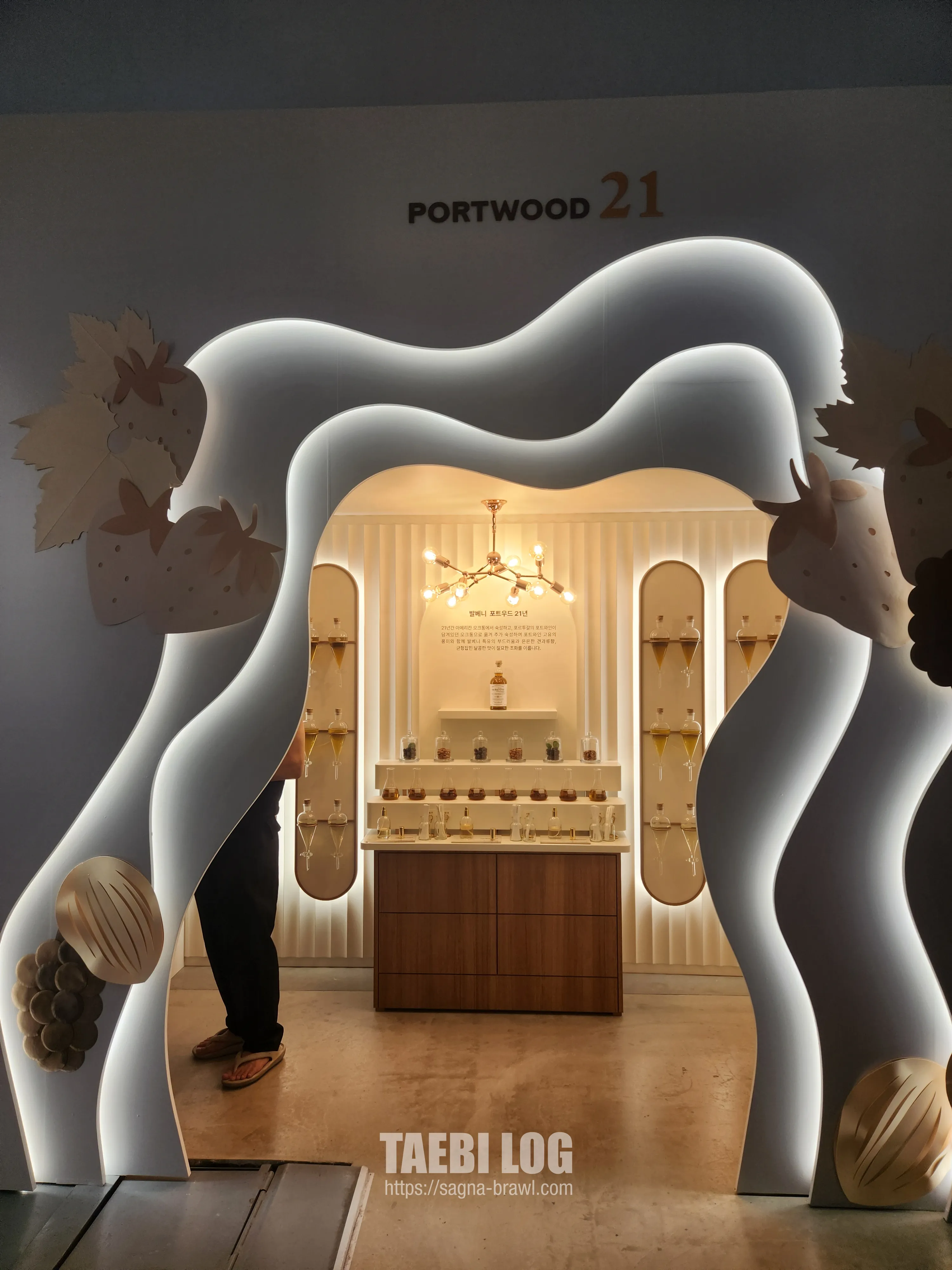 마지막은 포트우드21 전시관이 나왔습니다. 여기서는 포트우드 21의 향을 시향지에 뿌려서 맡아볼 수 있게 전시가 되어있었습니다. 포트우드 21의 향이 너무 좋아서, 집까지 향을 가져가려고 시향지를 받아 제 가방에 보관하였습니다. 전시 라인업 중 가장 비싼 술이었기 때문에, 이따가 마셔볼 페어링 세트도 기대가 되었습니다.