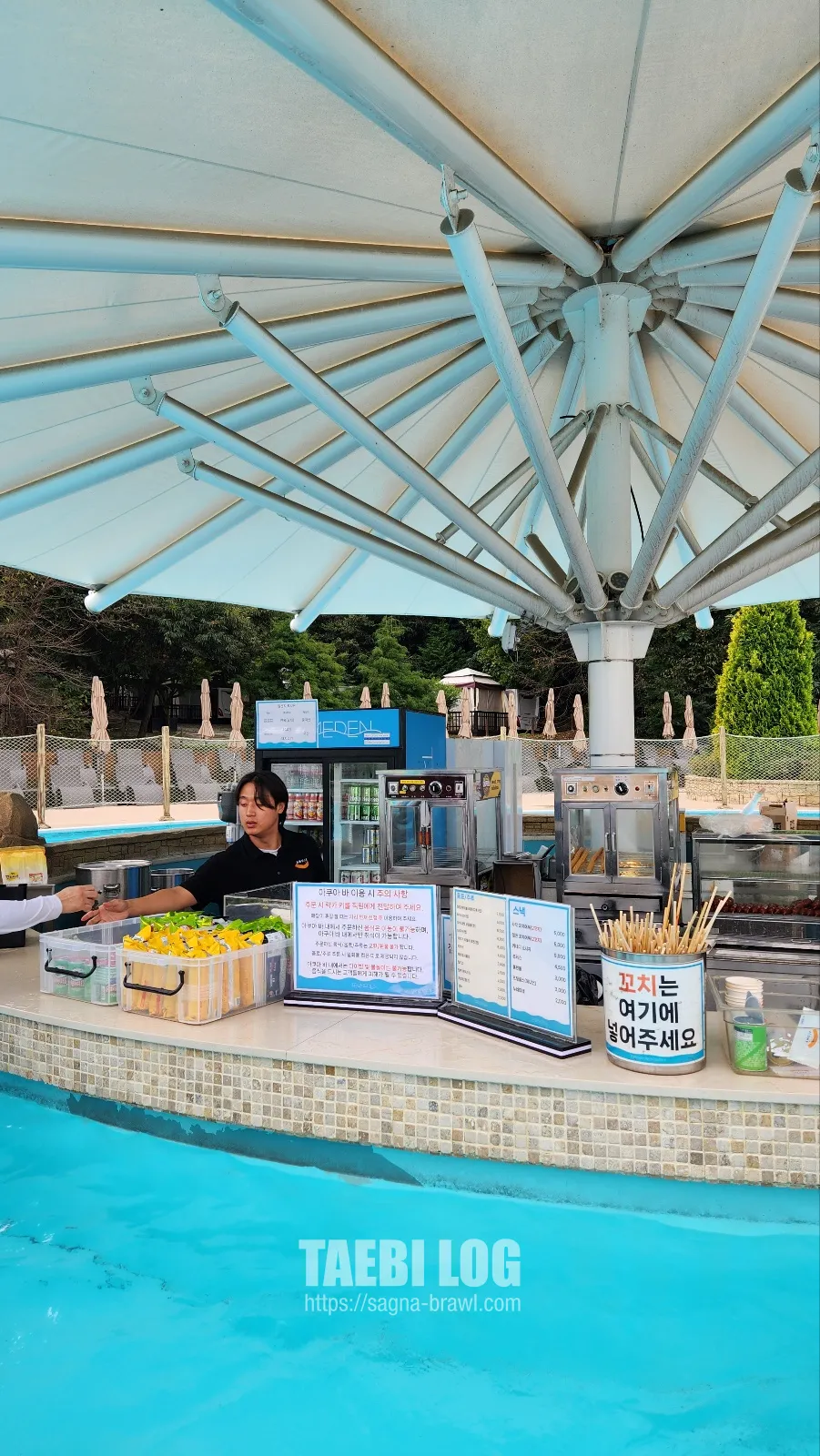 인피니티풀에는 야외 아쿠아바도 있습니다. 저와 와이프는 점심을 먹는대신, 이곳에서 핫도그와 어묵을 사 먹었습니다. 먹는 곳은 따뜻한 물이 엉덩이까지밖에 오지 않기 때문에 상당히 춥습니다. 그래서 어떻게 어묵과 핫도그를 먹었는지 잘 기억나지 않습니다 ^ㅡ^;;