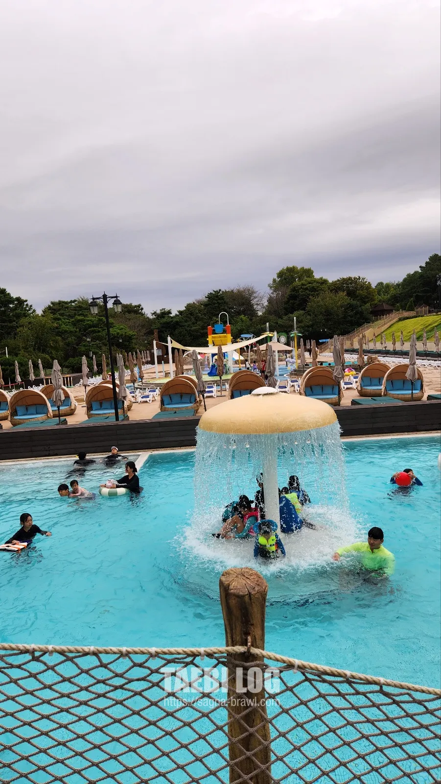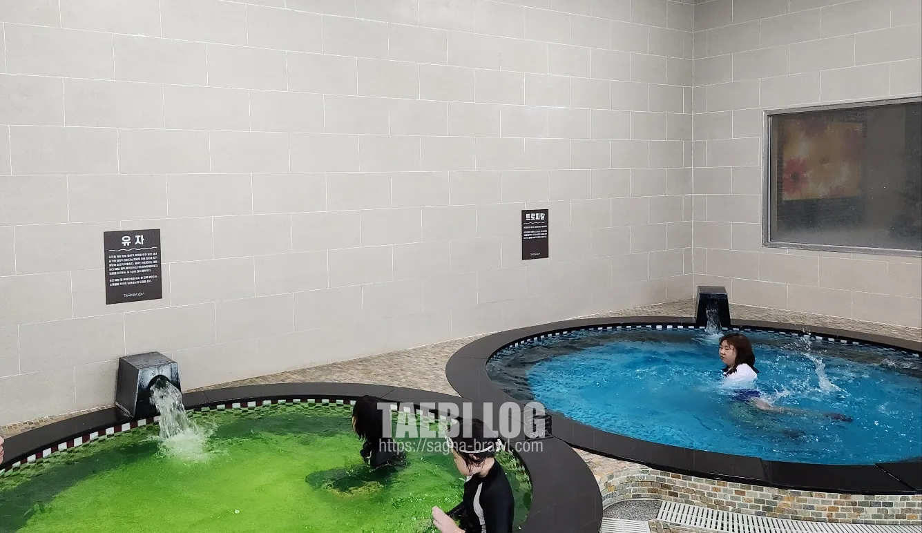 그리고 탈의실 입구 구석에는 유자풀과 트로피카풀이 있습니다. 트로피카풀은 좀 차갑고, 유자풀은 꽤나 따뜻한 풀 입니다. 많은 사람들이 유자풀에 모여있는 모습을 볼 수 있습니다. 사진은 사람들이 많이 빠졌을 때 촬영 해 보았습니다.