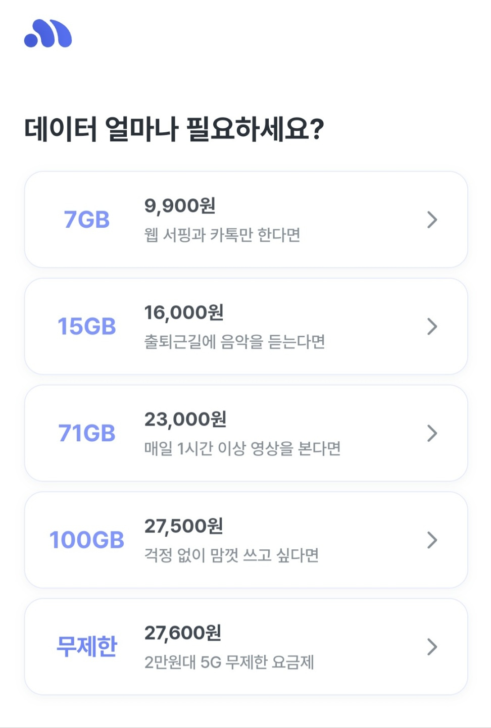 모요에 접속하여 로그인을 하면, 원하는 데이터를 선택할 수 있는 화면이 나옵니다. 저는 영상을 볼 수 있는 데이터 요금제를 선택하였습니다.