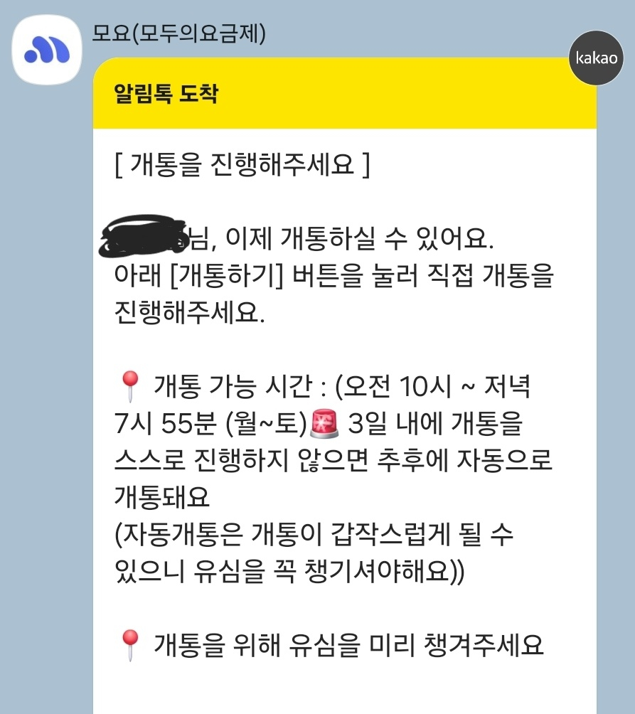 - 심카드를 받았다면 카톡으로 개통 요청하기를 실행할 수 있는 연락이 옵니다. 개통 과정을 확인 후 개통 요청을 진행하면 됩니다.