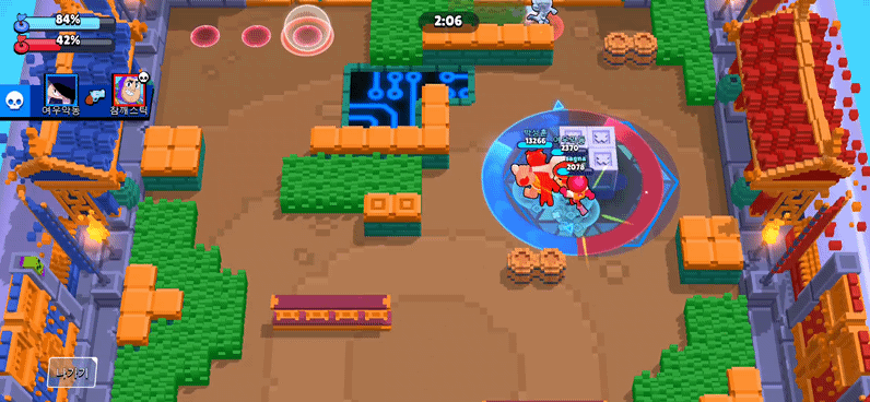 덤불에 숨어서 저를 노렸던 버즈라이트 이어도 가젯을 맞고 기절하여 우리 편의 합동 공격에 죽고 말았습니다. 숨어있다가 암살을 즐기는 어쌔신 계열에게도 상당히 효과적이라고 할 수 있습니다. 접근하는 모티스나 레온 등도 미플에게는 접근이 쉽지 않을 겁니다.