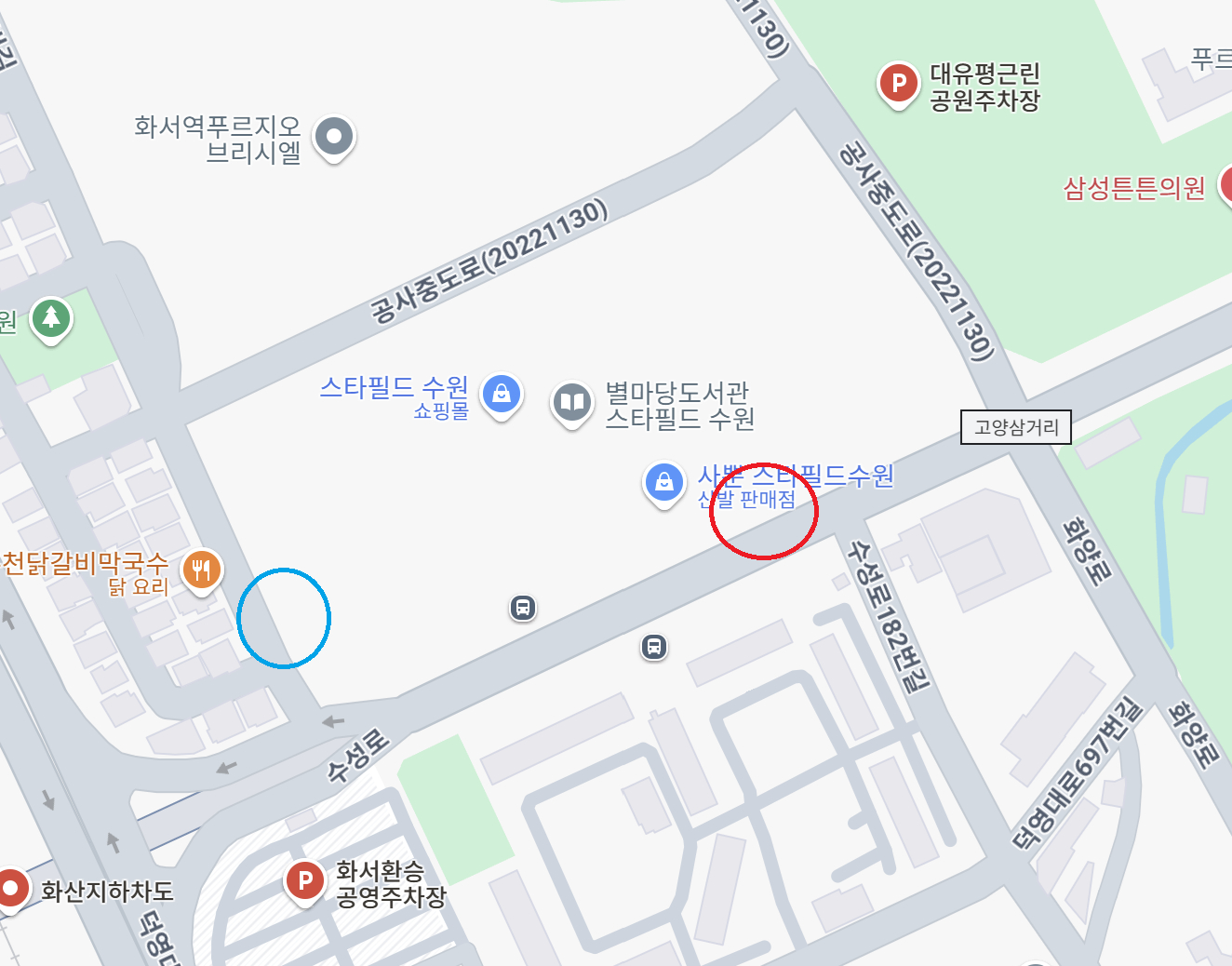 내비를 찍고 화서 스타필드로 가면, 빨간 원으로 표기된 주차장으로 안내를 합니다. 그래서 근처에 가보면 빨간 곳의 주차장으로 들어가기 위해 수많은 차들이 길게 줄을 서 있습니다. 저 줄에 합류하지 말고, 왼쪽 파란원으로 표기된 지역에 주차장 입구가 또 있습니다. 저기는 사람들이 잘 모르는 건지... 줄이 거의 없으므로, 파란 원이 표기된 곳으로 이동하셔서 주차장으로 진입하시면 되겠습니다!