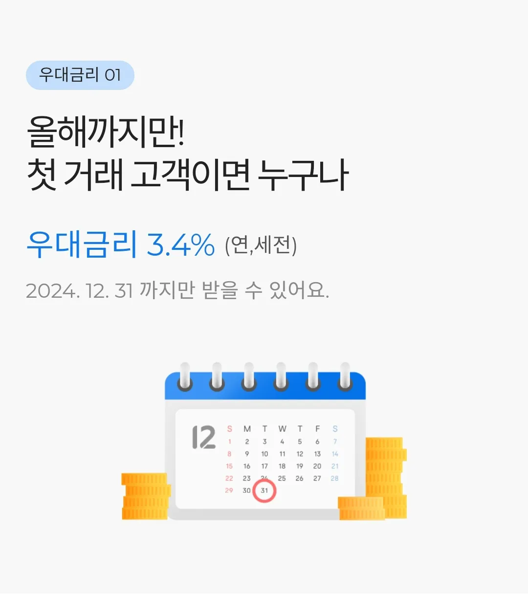 첫 번째로, 2024년 첫 거래 고객이면 그냥 3.4%를 줍니다. 너무 쉽습니다! 그냥 가입하면 됩니다.