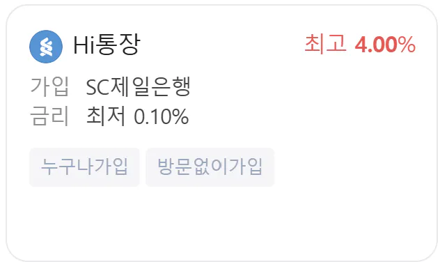 그래서 현재 검색 시 가장 높은 금리의 파킹통장인 SC제일은행의 Hi통장을 개설해 보았습니다.