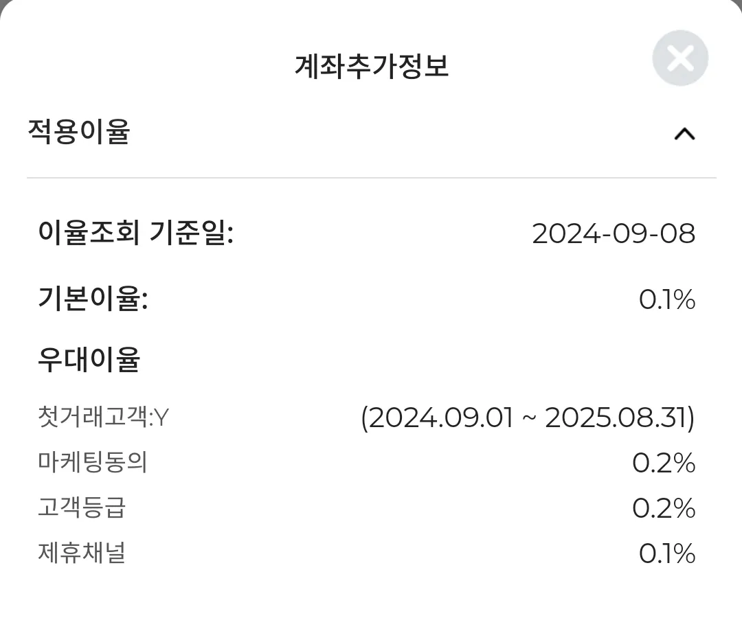 가입 완료 후 해당 통장 조회 → 상세(화면 오른쪽 위) → 적용이율 순으로 누르면 위와 같이 이자 적용여부가 확인 가능합니다. 가입 첫 달은 모든 이율이 적용된다고 하네요. 다음 달에도 고객등급 이율이 적용되는지는 확인이 필요할 것 같습니다.