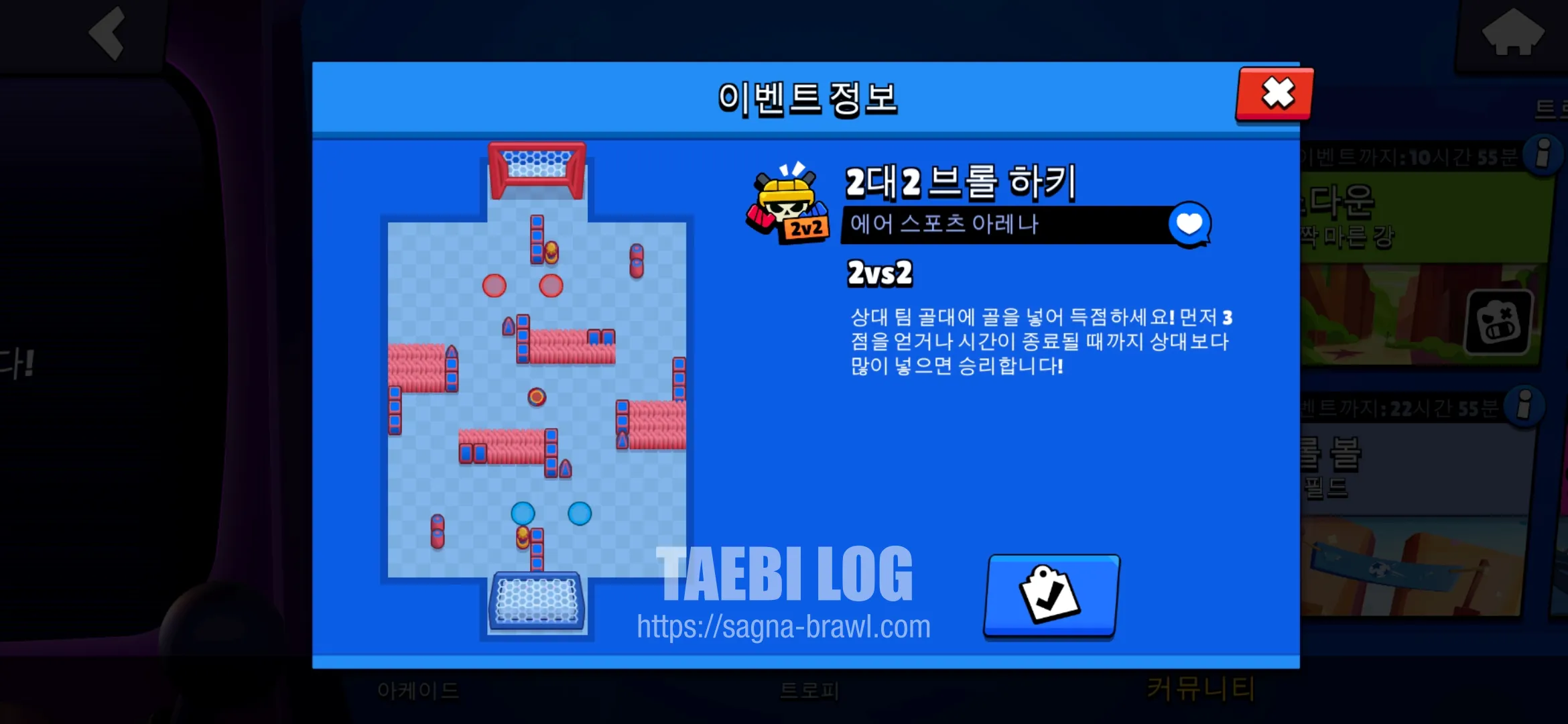 다음은 2대 2 브롤 하키입니다. 상대 팀 골대에 골을 넣어 득점하는 게임으로, 먼저 3점을 넣으면 승리합니다. 기존 브롤 볼 과는 다르게 아이스하키 느낌으로 공을 던지면 공이 계속 날아갑니다. 벽에 부딪혀도 튕겨 나오기 때문에 날아간 공을 탈취해서 상대 골대로 던지고, 상대를 빠르게 죽이는 것이 중요하다고 할 수 있습니다.