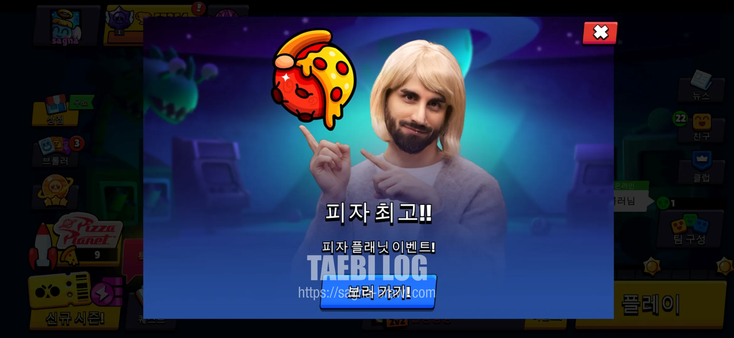 오늘 오후 6시 이후에 브롤스타즈에 접속하면, 위와 같이 피자 최고!! 라는 멘트와 함께 피자 플래닛 이벤트 링크가 걸려있습니다. 화면이 너무 킹 받아서(?) 저는 링크를 누르지 않고 바로 닫아버렸습니다.
