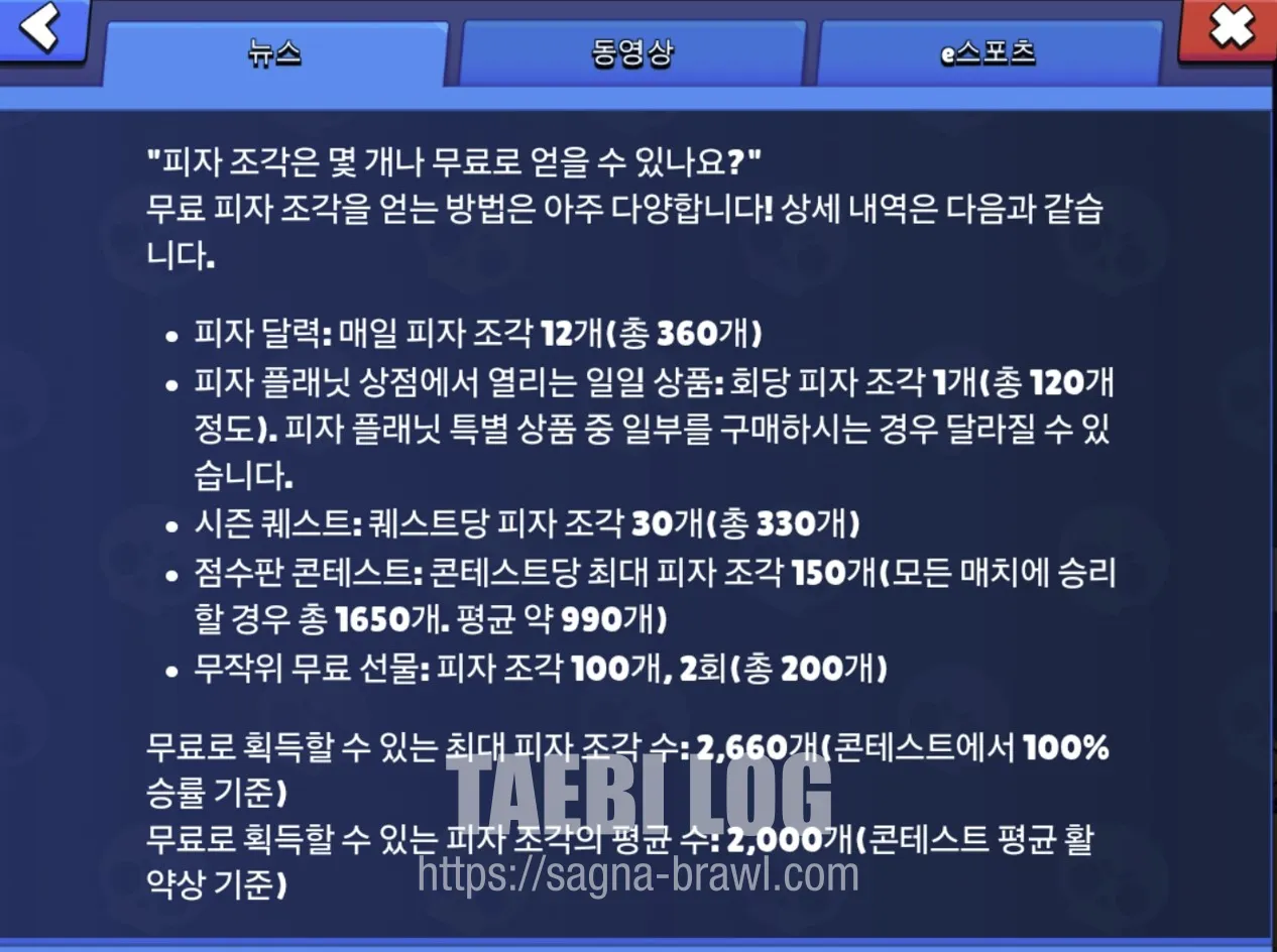 피자 획득 방법은 위와 같이 브롤스타즈 게임 내 뉴스에 소개되어 있습니다.