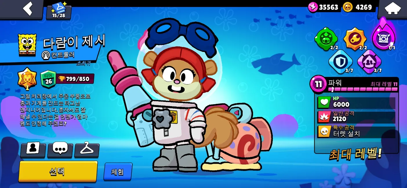 스펀지밥 이벤트가 등장하자마자 가장 가지고 싶었던 스킨입니다. 브롤러의 생김새가 가장 귀여웠고, 또 위의 6종 캐릭터 중 가장 좋아하는 브롤러가 제시였기 때문입니다.